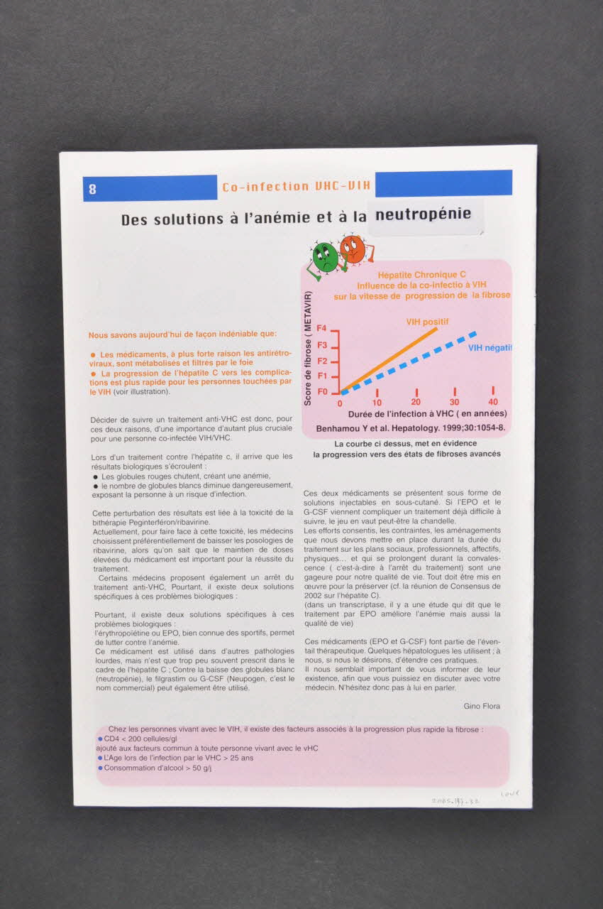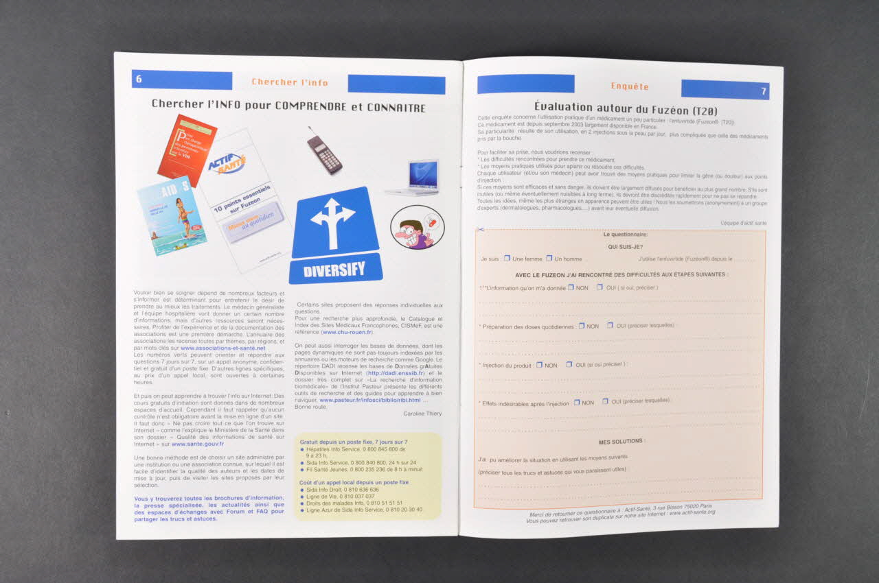 Sommaire partiellement commenté : - p.2 Mieux vivre au quotidien. / Tous les aspects de la vie, rencontre avec Catherine Tourette Turgis (Counselling / Le style du soignant a un impact sur le comportement de son patient. Ils ne doivent pas faire porter la non observance sur le dos des personnes vivant avec le VIH.) - p.3 Gérer les effets indésirables. / Contre les diarrhées, la piste glutamine. - p.4-5 Stratégies thérapeutiques. / Charge virale indétectable sous traitement, un objectif prioritaire - p.6 Chercher l'Info / Chercher l'Info pour comprendre et connaître (sites internet et lignes téléphoniques) - p.7 Enquête / Evaluation autour du Fuzéon (T20) (questionnaire à détacher et remplis auprès de personnes utilisant le Fuzéon (difficultés rencontrées et solutions trouvées) - p.8 Co-infection VHC - VIH / Des solutions à l'anémie et à la neutropénie / Le texte de l'éditorial, en caractères noirs sur fond blanc présente le bulletin : bimestriel destiné en premier lieu aux personnes vivant avec le virus, associé à un site internet, une ligne téléphonique, et à des groupes de réflexion.