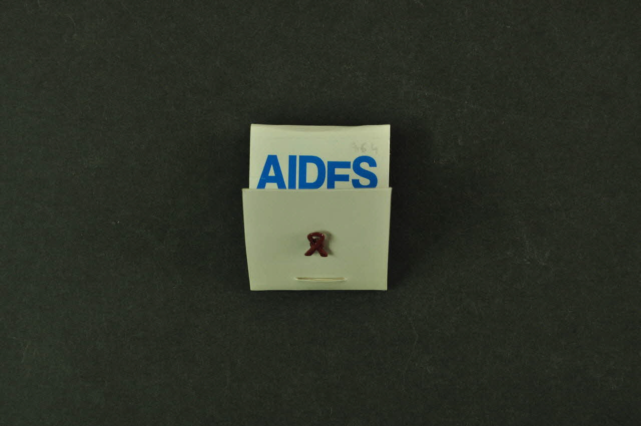 En métal doré, le pin's représente un ruban rouge. Il est attaché à un carton blanc plié en trois. Une inscription est imprimée en bleu au verso et sur le rabat.Inscriptions