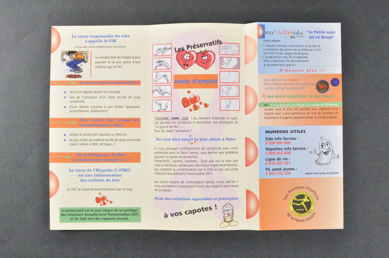 Feuillet 1 (avec dessin humoristique de quelqu'un écrasant le virus) : Ce qu'est le sida, modes de transmission, prévention, on n'attrape pas le sida en embrassant quelqu'un, hépatite C.