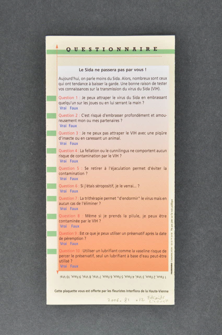 Au dos on trouve un questionnaire de dix questions à répondre par vrai ou faux.