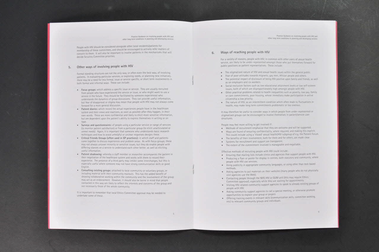 Contents // 1. Introduction // 2. Creating a culture for patient and public involvement // 3. Why should PCTs and other statutory bodies involve people with HIV? // 4. What structures can patients & pepole with ongoing medical conditions // be involved in? // 5. Other ways of involving people with HIV // 6. Way of reaching people with HIV // 7. How to get the best from involvement of people with HIV // 8. Individual involvement vs. community representation // 9. Using Expert Patients or community leaders // 10. Case studies illustrating key methods and issues // 11. Good practice checklist for patient involvement // 12. Further sources of useful information (Page précédant la page 1), à l'intérieurDate