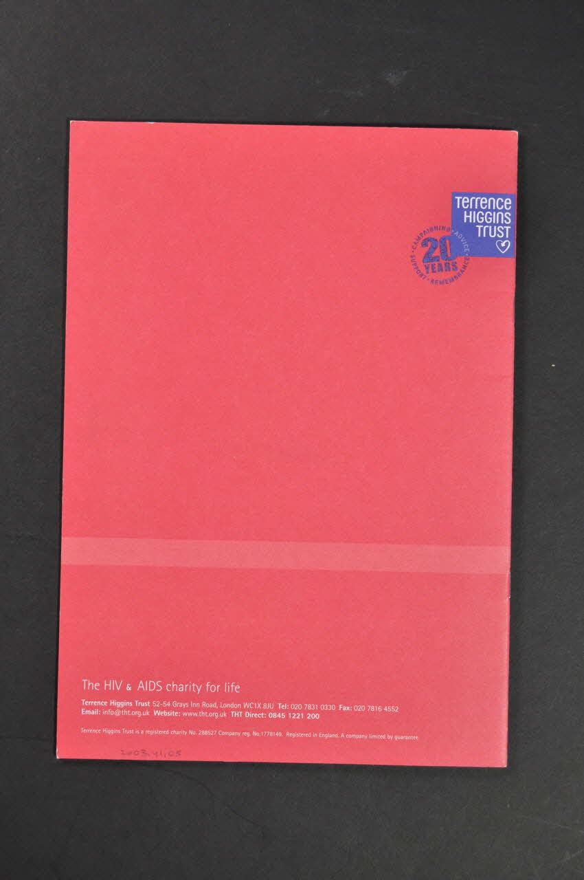The HIV & AIDS charity for life // Terrence Higgins Trust 52-54 Grays Inn Road, LOndon WC1X BJU Tel: 020 7831 0330 [...] (En blanc, en bas, adresse de l'association), versoDécor