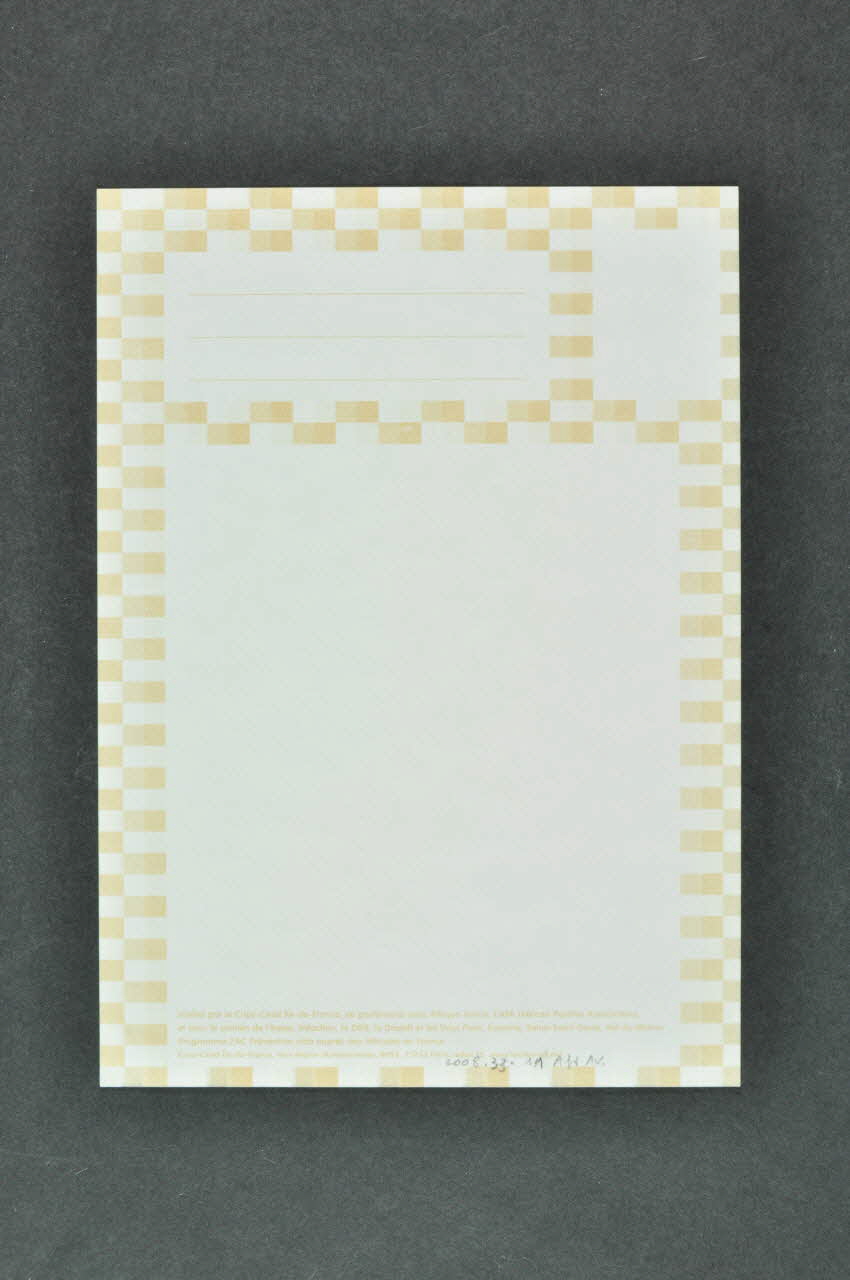De forme rectangulaire, la carte postale en carton se lit verticalement. Au recto figure la photographie couleur d'un homme en buste. Au dessus de son visage se trouve un phylactère rectangulaire contenant des inscriptions noires et blanches. En partie supérieure des inscriptions noires et blanches sont imprimées sur un rectangle gris. Tout autour du recto est disposé un damier blanc, gris, marron et noir aux bords irréguliers. Au verso, sur un fond blanc, on retrouve un damier dans les tons beiges à orange. Le damier délimite les espaces dédiés au timbre et à l'adresse. En partie inférieure apparaissent des inscriptions beiges.Inscriptions