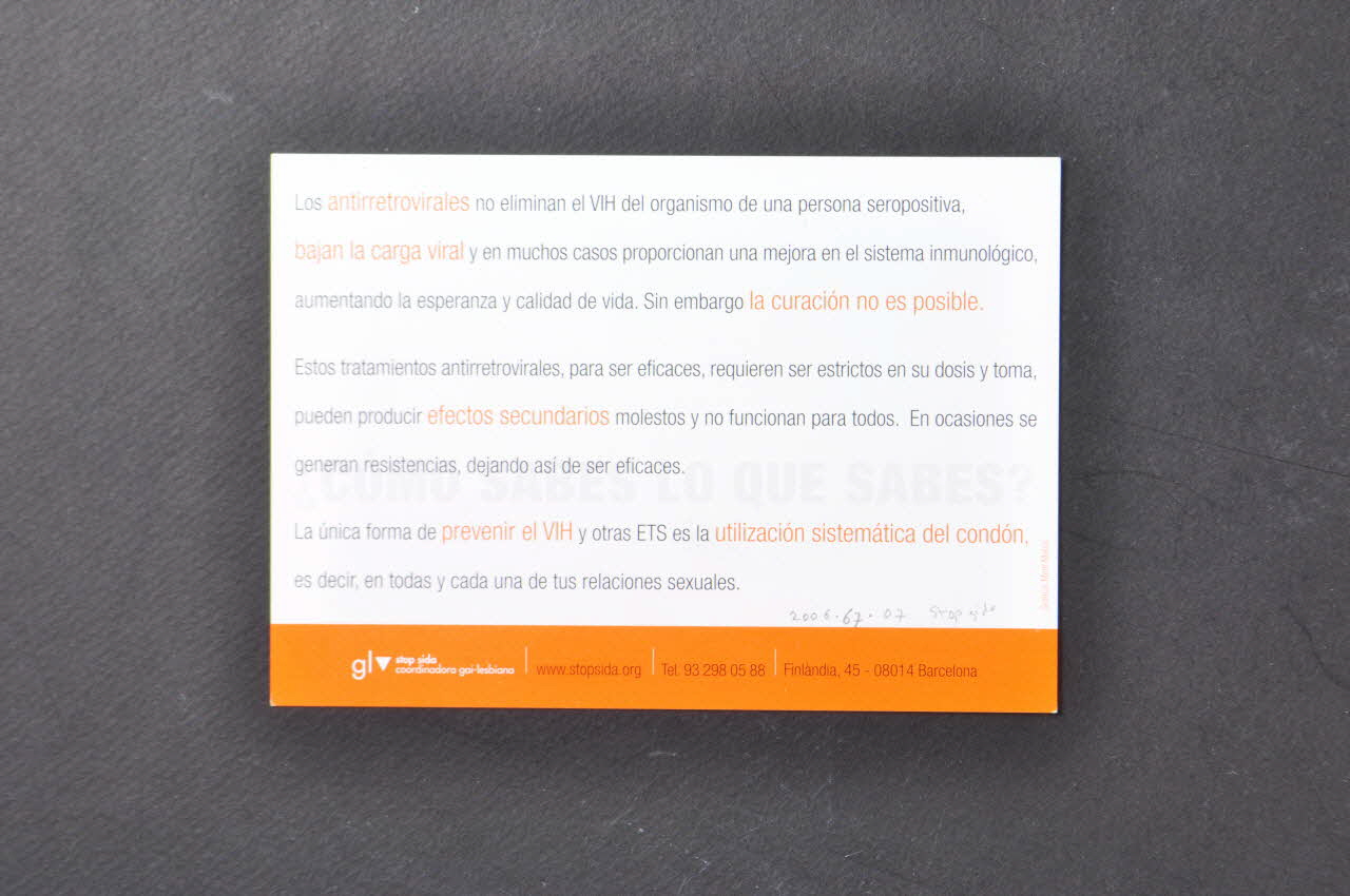www.stopsida.org // Tel. 93 298 05 88 // Finlandia, 45 - 08014 Barcelona (au milieu et à droite), en basLos antirretrovirales no eliminan el VIH del organismo de una persona seropositiva [...] La unica forma de prevenir el VIH y otras ETS es la utilizacion sistematica del condon, es decir, en todas y cada una de tus relaciones sexuales. (Seuls le début et la fin du texte sont transcrits), versoEso es lo que creen algunos gays segun muestran [...] Y tu, que estas haciendo? (En bas à droite // Seuls le début et la fin du texte sont transcrits), rectoSlogan