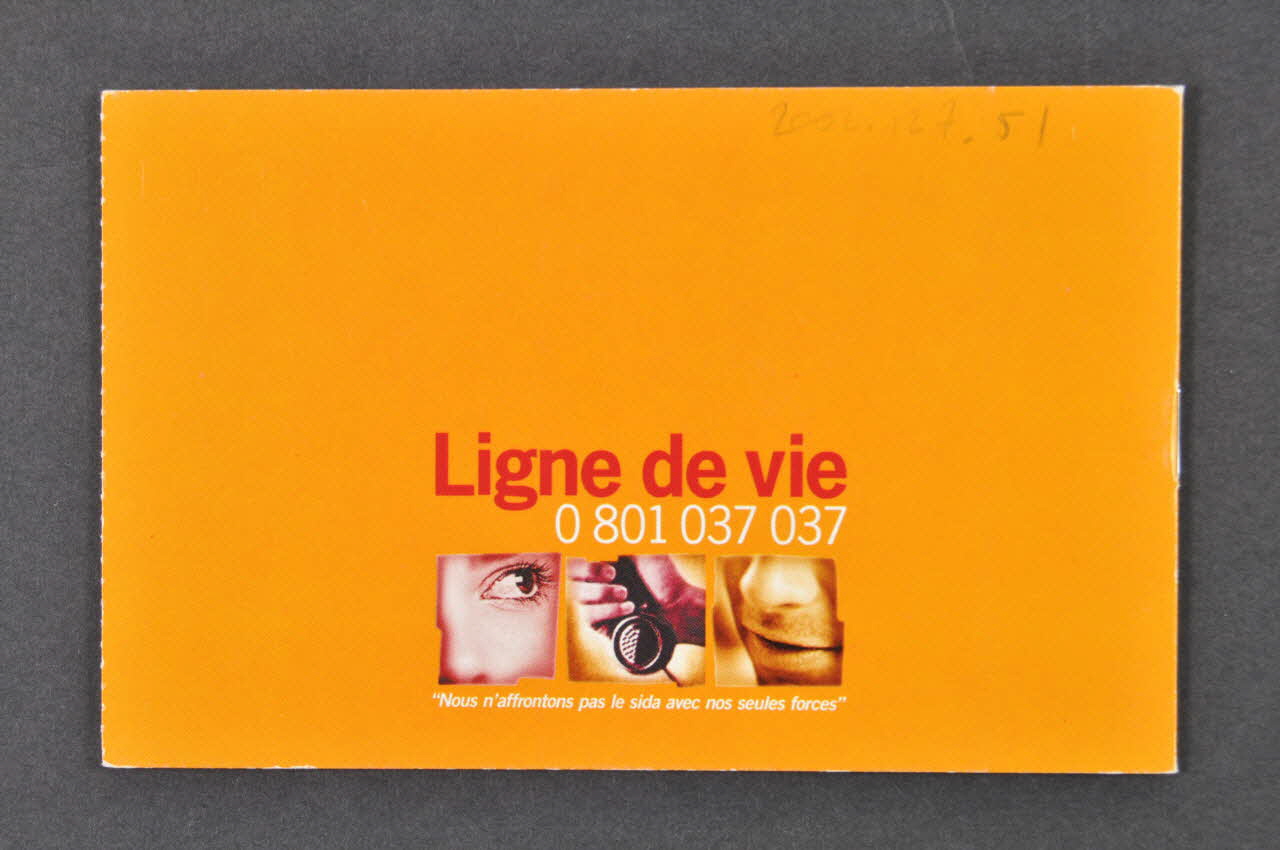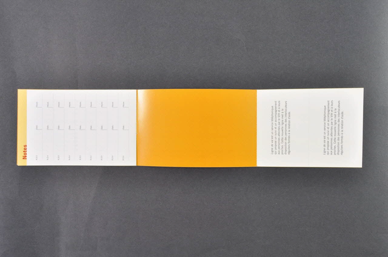 Ligne de vie est un service téléphonique qui propose un suivi et un accompagnement aux personnes atteintes par le VIH et à leurs proches. Cette nouvelle ligne met à la disposition des personnes des interlocuteurs réguliers formés à la relation d'aide. (Sur les cartes détachables)p.1 [...] Ligne de vie est un service téléphonique qui vous propose un soutien, suivi si vous le souhaitez, avec des interlocuteurs réguliers, afin de vous aider à trouver un point d'ancrage quand les incertitudes et l'instabilité brouillent vos repères personnels [...] // // p. 2 [...] Qu'il s'agisse des risques de transmission, de l'éventualité d'un traitement, des problèmes pour le suivre, d'un deuil ou de difficultés sociales, affectives, professionnelles ou financières. Nous prendrons le temps nécessaire pour vous aider à dépasser ces moments difficiles. // Ne pas être seul pour chercher des réponses // // p. 3 Des hommes et des femmes à votre écoute. // // p. 4 Comment fonctionne la ligne // [...] tous les jours de 18 à 21h sauf mercredi et dimanche [...] pour le moment pour personnes habitant en Ile-de-France ou venant s'y soigner [...] nous vous proposerons des rendez-vous téléphoniques gratuits (un numéro vert vous sera communiqué) // // p. 5 Un service complémentaire // [...] Vous faciliter l'accès aux services de proximité dans le réseau médical, social et associatif [...] // // p. 6 Une action interassociative // Ligne de vie est un service souhaité et soutenu par plusieurs associations. Sida Info Service (SIS) s'appuyant sur son expérience en matière d'écoute et de soutien téléphonique en est l'opérateur. L'action est financée conjointement par Ensemble Contre le Sida, Solidarité Sida, et SIS. SIS, Aides (Comité Ile-de-France et fédération), Sol En Si (Solidarité Enfants Sida) et Solidarité Sida ont mis en commun leurs expériences du vécu de la maladie dans le but de mieux répondre à vos besoins. Ligne de vie, c'est enfin la réponse qu'une personne atteinte par le VIH, Pierre Kneip - fondateur et ancien directeur de Sida Info service - a souhaité offrir à ceux qui sont éprouvés par le sida. (Elements de texte à l'intérieur de la brochure), à l'intérieurDécor