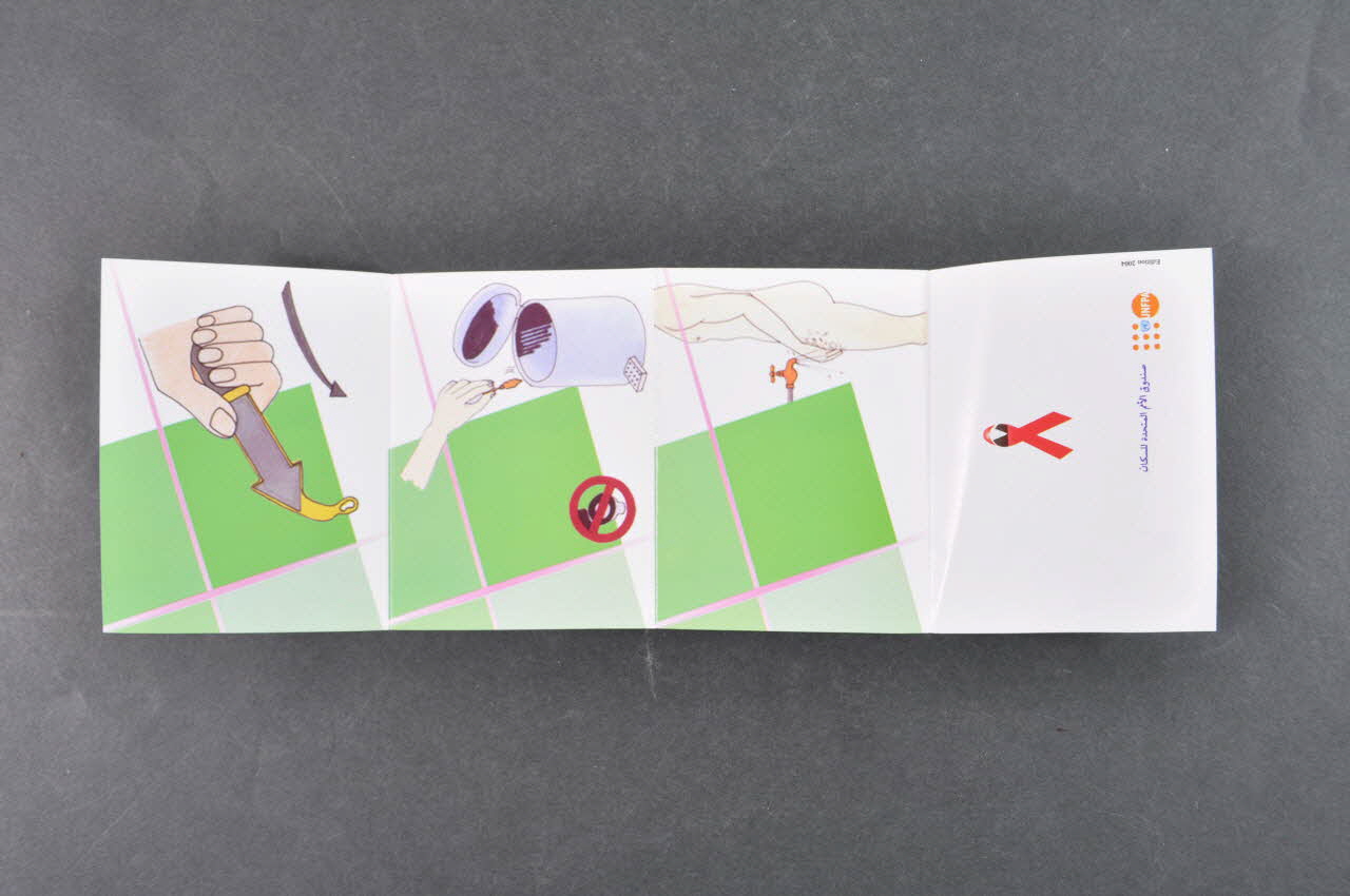 La couverture, à fond vert et blanc, présente deux coeurs avec des visages d'homme et de femme. A gauche se trouve un texte en caractères arabes Les feuillets présentent des chémas sans légendes : ouverture de l'enveloppe du préservatif, pose sur le pénis en érection, déroulement, enlever et jeter, se laver. Sur le feuillet 7 se trouve un petit ruban rouge et le logo de l'UNFPA.Décor