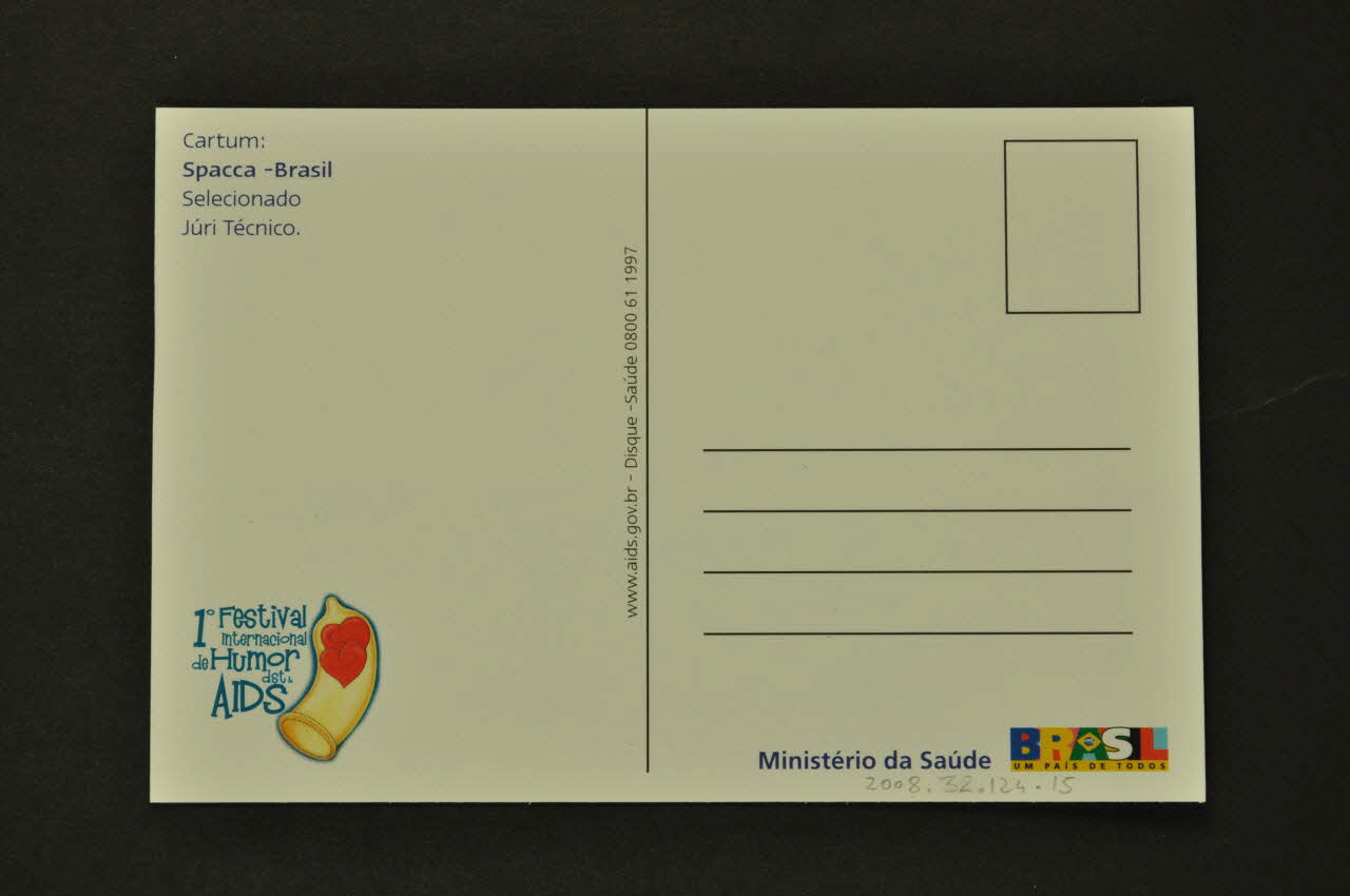Ministério da Saúde BRASIL UM PAIS DE TODOS (en bas à droite), verso1° Festival // internacional // de Humor // dst & // AIDS (en bas à gauche, avec un dessin de deux coeurs dans un préservatif.), versoAdresse, date