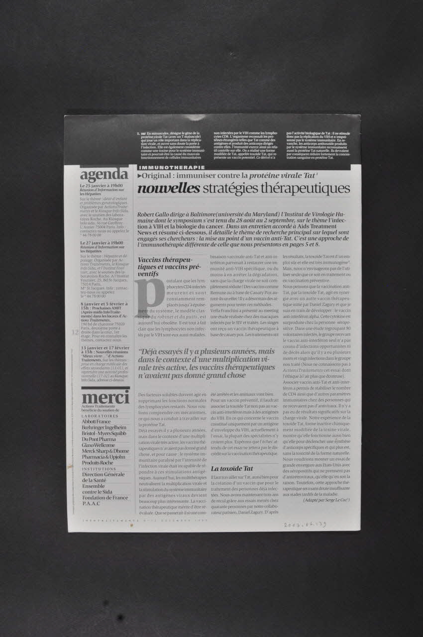 Précisions sur le contenu : - p.1 col 1 Extrait du sommaire et coordonnées de la revue - p.1 col 2-3 réunies : Editorial "Les pays du sud... en panne de traitements" - p.1 col 4, p.2 col 2 à 4, p.3 col 1 et 2 Rubrique Associations : "Vaincre le sida, qui assurait depuis des années un suivi à domicile aux malades du sida doit fermer ses portes. Docteur Patrice Meyer, un homme blessé... / "Vaincre le Sida, historiquement la première association de lutte contre le sida, se voit aujourd'hui dans l'obligation de fermer ses portes. Erreurs de gestion, carences des pouvoirs publics ? InfoTraitements s'est interrogé sur l'histoire d'une faillite annoncée. Nous avons ouvert nos colonnes au docteur Patrice Meyer, créateur de VLS, pour lui permettre de s'expliquer sur cet échec..." / "Bref historique" / "Structure actuelle de VLS" / "Les débuts de la fin . Ayant créé ce service de maintien à domicile dans l'urgence pour parer aux carences du service public, VLS souhaite alors devenir une prestation 'légale'" / "Un désinvestissement des pouvoirs publics ; Patrice Meyer souhaite que l'ensemble du tissu associatif se mobilise pour rester vigilant sur cette tendance lourde à la démobilisation face aux problèmes liés au sida" - p.2 col 1 Avis divers - p.3 col 4 Les après midi d'Infotraitements / Abonnement - p.4 col 1 Bulletin de cotisation à l'association - p.4 col 2 à 4, p.5 col 1 Rubrique Qualité de vie : "Apporter des réponses et un soutien aux personnes qui affrontent le VIH et ses traitements. Mieux vivre avec le VIH, mieux vivre avec les traitements" / "Quelque 70.000 personnes suivent aujourd'hui un traitement anti-VIH en France. Pour la plupart d'entre elles, le sida a changé de visage depuis l'arrivée des multithérapies en 1006. Le spectre de la mort annoncée a été remplacé successivement par le deuil du deuil, des effets secondaires agaçants, l'observance pas très marrante, une vie sexuelle pas toujours au top, la réinsertion professionnelle pas évidente, puis par des lipodystrophies qui sapent le moral... On pourrait continuer la liste et on se demande ce qui peut encore nous tomber dessus cette année alors que la plupart de ces problèmes n'ont pas trouvé de solutions acceptables pour tous." / "Le nouveau groupe de parole d'Actions Traitements n'a pas de sujet particulier si ce n'est le vécu de la séropositivité dans toutes ses dimensions" / "1? Un programme qui démarrera en janvier" / "2. Un groupe de parole" / "3. Des réunions publiques" / "4. Une rubrique dans InfoTraitements" - p. 5 col 2 et 3, p.6 col 2 à 4, p.7 col 1 à 3 Rubrique Immunothérapie : "Arrêter les antirétroviraux, au moins temporairement, grâce à une immunité cellulaire retrouvée. Le rêve fou de la vaccinothérapie" / L'an 2000 verra l'explosion de la recherche en immunothérapie. En fait, les progrès accomplis, tant dans la compréhension de la réponse immunitaire que dans la stimulation de l'immunité contre le VIH, débordent largement du cadre du sida et font avancer toute l'immunologie ainsi que la recherche sur les infections virales et leurs traitements. La France est bien placée dans ce mouvement avec quatre essais sous l'égide de l'ANRS qui démarreront au premier semestre 2000." / "La réponse immunitaire" / "La réponse immunitaire contre le VIH" / "A la recherche du CD4 perdu. Ces fameux CD4 spécifiques du VIH, véritable arlésienne du déropo, sont en fait perdus très vite après la primo-infection, sauf chez les ALT (asymptomatiques à long terme)" / " Les quatre essais de l'ANRS" / "En attendant les résultats. On espère que quelques patients feront preuve d'un contrôle cellulaire efficace plus ou moins long de la multiplication virale, ce qui serait déjà un joli résultat" - p. 5 col 4, p.6 col 1, p.7 col 4 Glossaire : vaccinothérapie - p.8 col 2 à 4, p.9 col 1 à 3, p.10 col 2 à 4, p.11 col 1 à 3 Rubrique Interleukine 2 : "Une étude importante montre le rôle fondamental des lymphocytes CD8 cytotoxiques pour contrôler le VIH. Arrêter les antiviraux et s'injecter de l'IL2" / "Arrêter un traitement antirétroviral efficace se solde habituellement par un rebond très rapide de la charge virale, même si elle était indétectable. Il n'y a que très peu d'exceptions, comme le fameux patient de Berlin. A l'ICAAC on a beaucoup parlé d'une petite étude qui fait part d'un succès relatif chez neuf volontaires qui ont arrêté les antiviraux sous certaines conditions. Leur charge virale a fortement et rapidement rebondi, comme prévu, mais elle fut par la suite partiellement contrôlée par le système immunitaire sans qu'ils aient recommencé les antiviraux. Nous publions l'interview de l'auteur de l'étude par la revue américaine Aids Treatment News" / "Le jeu consiste à mettre assez d'IL2 pour activer les lymphocytes T tout en utilisant une dose insuffisante pour activer les natural killers" / "Le système immunitaire maintient des virus à l'état dormant d'une façon très efficace. Il devraut donc être possible de l'aider à faire la même chose avec le VIH" / "Nos résultats suggèrent qu'une stimulation encore plus complète du système immunitaire pourrait conduire à un contrôle total de la réplication du VIH" / "L'objectif de ces essais est d'accélérer la restauration immunitaire. je pense que ce sera bien le cas mais que nous ne devons pas imposer des toxicités aux patients" - p.8 col 1, p.9 col 4, p.10 col 1 : Questions sur le serveur minitel et réponses par un médecin. - p.11 col 4 Appel à solidarité. "Appel aux lecteurs pour des médicaments pour les pays du Sud" - p.12 col 1 Agenda - p.12 col 2 à 4 Rubrique Immunothérapie : "Original : immuniser contre la protéine virale Tat. Nouvelles stratégies thérapeutiques" / "Robert Gallo dirige à Baltimore(université du Maryland) l'Institut de Virologie Humaine dont le symposium s'est tenu du 28 août au 2 septembre sur le thème L'infection à VIH et la biologie du