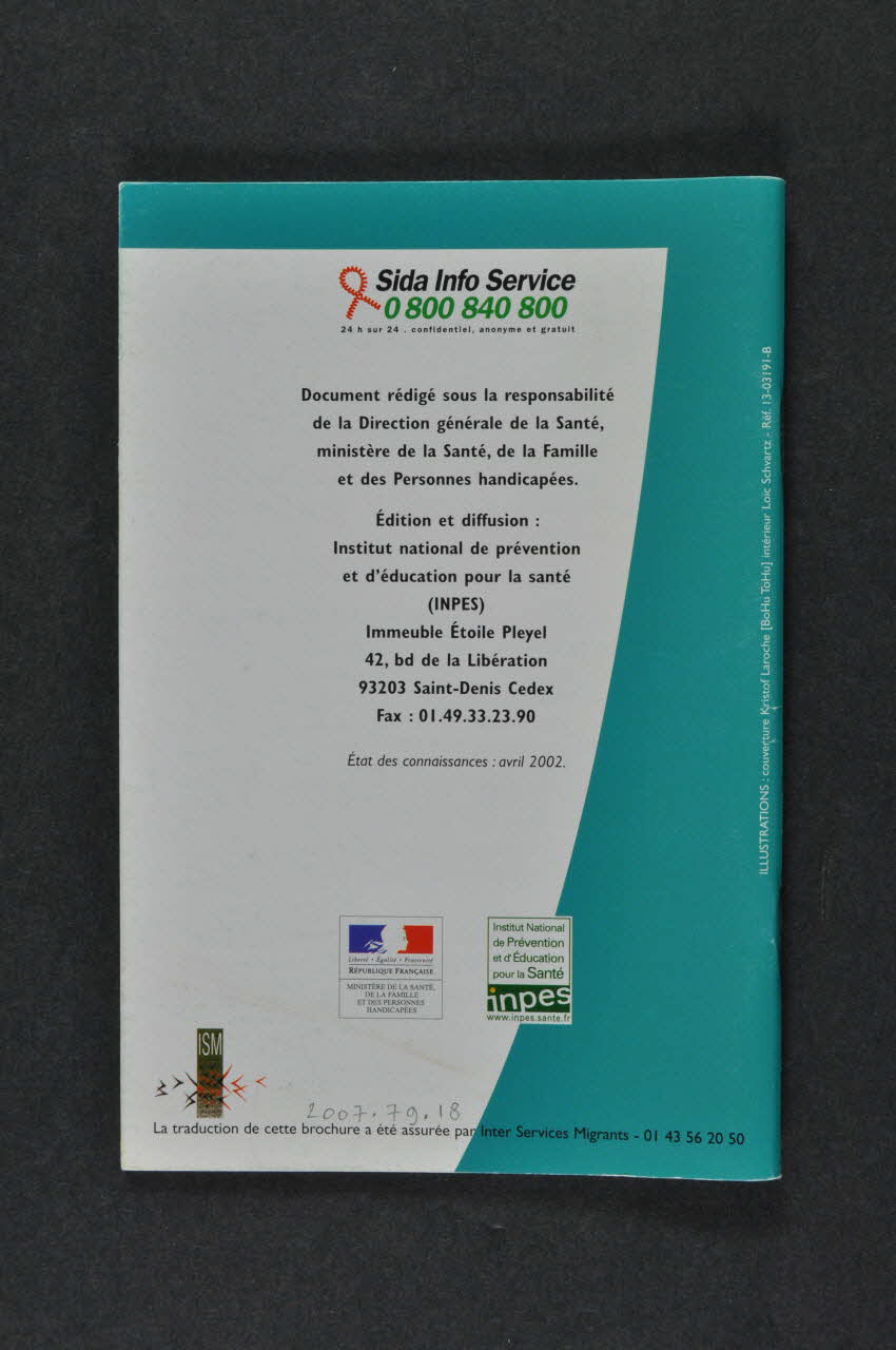 En bas, en caractères jaunes puis bleu, est inscrit le titre de la brochure. Au dos, sur un fond mi blanc mi vert, figurent les logos du Ministère de la santé et de l'INPES. Une indication précise que le livret fait état des connaissances à avril 2002. L'intérieur est présenté de façon aérée, avec des sous titres bleus, et plusieurs illustrations humoristiques type BD.Inscriptions