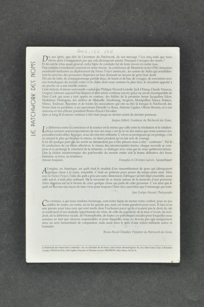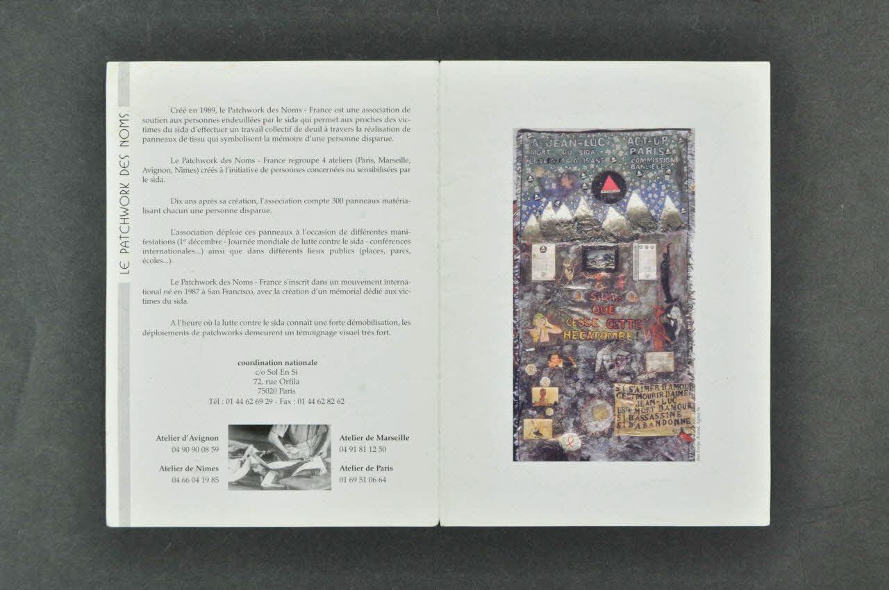A JEAN-LUC // MORT DU SIDA // LE 16/01/94 A 35 ANS // // ACT-UP // PARIS // COMMISSION // BANLIEUES // // ACTION = VIE // // SIDA // QUE // CESSE CETTE // HECATOMBE // // OLENCE = MORT // // SI S'AIMER D'AMOUR // C'EST MOURIR D'AIMER // JEAN-LUC // EST MORT D'AMOUR // SI D'ASSASSINE // SI D'ABANDONNE // // tous contre le sida (page de droite, sur le panneau, de gauche à droite et de haut en bas.), à l'intérieur(Dix ans après, que dire de l'aventure du Patchwork, de son message? Les cinq naïfs que nous étions alors n'imaginaient pas que cela dérangerait autant. Pourquoi s'occuper des morts? Et devant le refus quasi général, notre ligne de conduite fut de tenir envers et contre tous. // Puis, certains évènements jouèrent en notre faveur; la conférence de Montréal où les ONG françaises assistèrent médusées au déploiement du Names Project américain; les assises de Aides qui sensibilisèrent les proches des personnes disparues en leur donnant un moyen de gérer leur deuil. // Dix ans de lutte, de compagnonnage parfois déçu, de hauts et de bas, de voyages, de rencontres avec nos homologues du monde entier et la chose dont nous sommes le plus fiers, le réconfort apporté à un proche ou à une famille entière. // Cette histoire d'amour universelle voulue par Philippe Pierard-Lestoile, Jack L'Etang, Claude Vinueza, Gregory Johnson aujourd'hui disparu et moi-même continue encore grâce au savoir incomparab), versoCréé en 1989, le Patchwork des Noms - France est une association de soutien aux personnes endeuillées par le sida qui permet aux proches des victimes du sida d'effectuer un travail collectif de deuil à travers la réalisation de panneaux de tissu qui symbolisent la mémoire d'une personne disparue. // // Le Patchwork des Noms- France regroupe 4 ateliers (Paris, Marseille, Avignon, Nîmes) créés à l'initiative de personnes concernées ou sensibilisées par le sida. // // Dix ans après sa création, l'association compte 300 panneaux matérialisant chacun une personne disparue. // // L'association déploie ces panneaux à l'occasion de différentes manifestations (1er décembre - Journée mondiale de lutte contre le sida - conférences internationales ...) ainsi que dans différents lieux publics (places, parcs, écoles...). // // Le Patchwork des Noms - France s'inscrit dans un mouvement international né en 1987 à San Francisco, avec la création d'un mémorial dédié aux victimes du sida. // // A l'heure où la lutte contre le sida connaît une forte démobilisation, les déploiements de patchworks demeurent un témoignage visuel très fort. (Page de gauche.), à l'intérieurDate