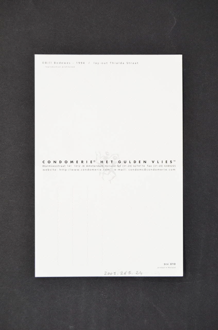CONDOMERIE HET GULDEN VLIES // Warmoesstraat 141 1012 JB Amsterdam Holland // tel (31-20) 6274174 (L'inscription est marquée en caractères noirs à la verticale.), versoNom