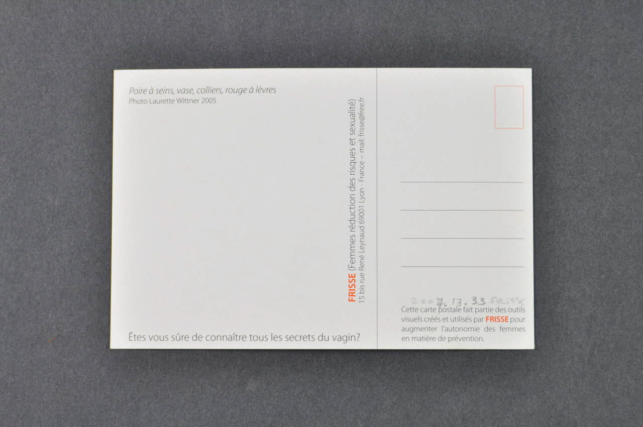 carte postale, "Poire à seins, vase, colliers, rouge à lèvre". Photo Laurette Wittner (pour genre)