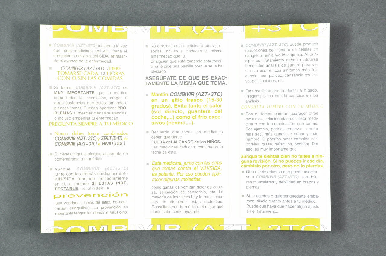 COMBIVIR (AZT+3TC) DEBE // TOMARSE CADA 12 HORAS // CON O SIL LAS COMIDAS. // // PREGUNTA SIEMPRE A TU MEDICO // // Nunca debes tmar combinados // COMBIVIR (AZT+3TC) y ZERIT (D4T), ni // COMBIVIR (AZT+3TC) e HIVID (DDC). // // no olvides la // prevención // // ASEGURATE DE QUE ES EXAC- // TAMENTE LA MISMA QUE TOMA. // // Mantén COMBIVIR (AZT+3TC) // en un sitio fresco (15-30 // grados). Evita tanto el calor // (sol directo, guantera del // coche,...) como el frio exce- // sivos (nevera,...) // // FUERA del ALCANCE de los NIÑOS. // // Esta medicina, junto con las otras // que tomas contra el VIH/SIDA, // es potente. Por eso pueden apa- // recer algunas molestias, // // CONSULTA SIEMPRE CON TU MEDICO // // aunque te sientas bien no faltes a nin- // guna revisión. Si no puedes ir ese dia, // cambialo por otro, pero no lo pierdas. // // SI TE OLVIDA LA TOMA // // SI INTERRUMPES EL TRATAMIENTO // ANTI-SIDA // // SI VOMITAS LAS PASTILLAS // // Es peor tomar mal las medi- // cinas que no tomarlas (Au recto et au verso.)Décor