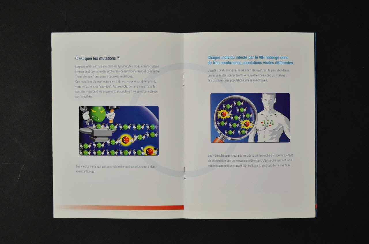 Introduction // - C'est quoi un virus ? // - C'est quoi le VIH ? // - Quelle est la différence entre le VIH et le sida ? // - Comment le VIH agit-il ? // - Quels sont les médicaments qui luttent contre le VIH ? // - C'est quoi les mutations ? // - Chaque individu infecté par le VIH héberge donc de très nombreuses populations virales différentes. // - Comment les mutations peuvent-elles émerger sous traitement ? // - Comment connaître les mutations qui existent sur le virus ? // - Est-ce grave si le virus présente des mutations ? // - Les mutations peuvent-elles disparaître ? // - Conclusion (au fil des pages), à l'intérieurLogo, nom de société