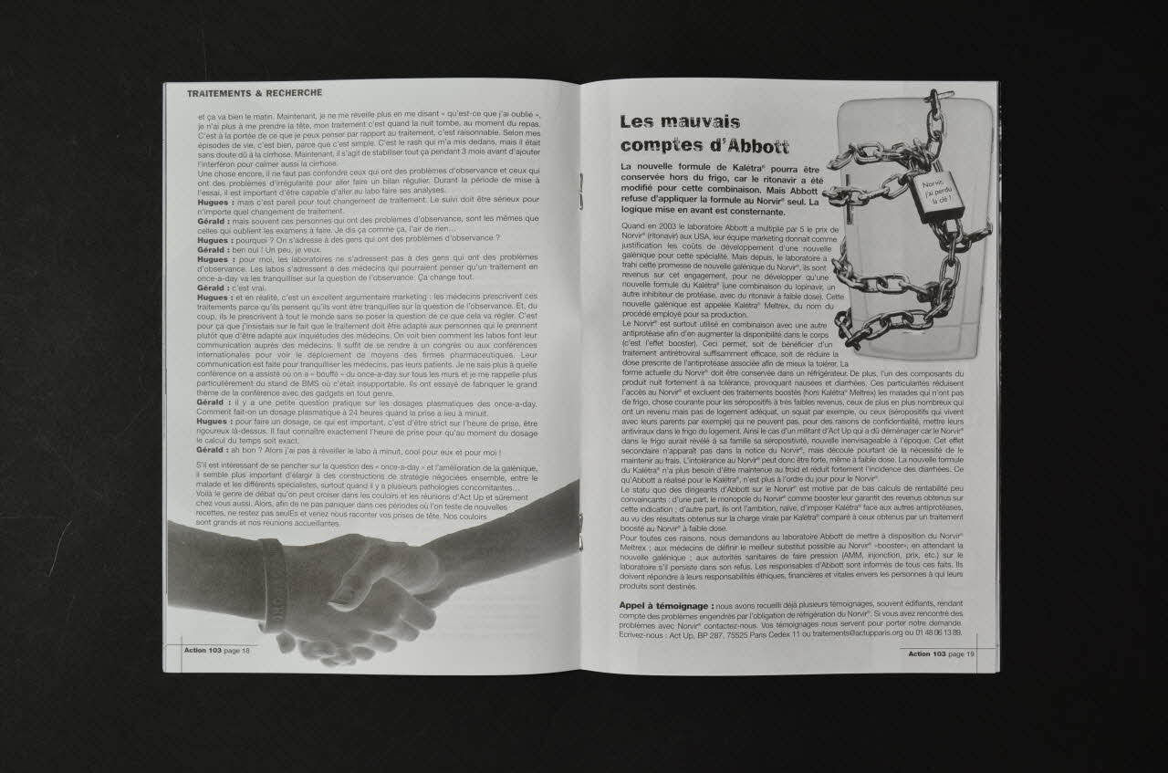 Cf Tee shirt 2007.80.01 / sommaire commenté par F.Loux : - p.2-3 Fond noir, impression en blanc. Editorial d'Emmanuel Chateau et Hugues Fischer, co présidents de l'association : "Rompre avec l'exceptionnalisme sida ?" A gauche de la page 2, bandeau blanc vertical avec coordonnées de la revue et de l'association. - p.4 à 15 Dossier "Porno et sida" (dossier illustré par des photos noir et blanc de crustacés et de coquillages) - p.4 En fond gris, photo agrandie de détail de pieuvre. En haut, en capitales blanches : "Porno et sida". En dessous, en noir, présentation du dossier. - p.5-6 " L'industrie de la pornographie doit prendre ses responsabilités" (tribune signée par des acteurs et actrices du porno) - p.7 "Des studios Replay à Pink TV un relapse qui n'en finit pas de se généraliser" - p.8 "Le marketing bareback, ou comment rendre acceptable l'inacceptable" - p.9 "La question de la fellation" - p.10-11 "La trop longue liste des actrices et des acteurs porno mortEs du sida" - p. 12-14 (p.12-13 en blanc sur fond noir) : "Droits des actrices et des acteurs" / "La situation en France" - p.15 "Rencontre avec Steve Paris" -p.16 à 19 Rubrique "Traitements & recherche" - p.16-18 "Je n'y pense plus qu'une fois par jour" Discussion entre deux membres de la Commission Traitements et Recherche sur l'intérêt pour les malades de la formule "once a day" lancée par certains laboratoires. Intérêt et inconvénient. par rapport à l'observance - p.19 "Les mauvais comptes d'Abbott" (Norvir devant toujours être conservé au froid) - p.20-21 Brèves de la permanence des droits sociaux (sur la COTOREP) Illustré par quatre photos noir et blanc de visuels (affichettes ?) avec un slogan et l'adresse de la permanence des droits sociaux : "Invalidité. 95% de sida 5% de capacité à l'emploi. Défends tes droits" / "Mes droits régressent. Mon sida progresse. Défends tes droits" / "Le sida mange à sa faim, pas moi. . Défends tes droits" / "Le sida a un toit, pas moi. Défends tes droits" - p.22 En blanc sur fond noir, en sous impression fenêtres sous un toit : "Logement : sida sans toit je n'ai que toi" - p.23-25 "Sida, envie d'en être ?" Interview de Frédéric, militant séropositif - p.26-27 Rubrique "Drogues et usages" : "La lutte contre le mésusage est pavée de bonnes intentions" (à propos du classement du Subutex comme stupéfiant.) - p.28-29 Rubrique International. "UNITAID. Une bonne idée qui ne doit pas servir de cache misère" - p.30 "Et Dieu dans tout ça?" (addition du nom de Jean Paul II à celui du parvis de Notre-Dame / réprobation des violences faites aux LGBT en Irak par le recteur de la grande Mosquée de Paris) - p.31 "Trans et VIH, après le silence" - p.32-33 2005, une année cahotique ... mais nous comptons sur vous en 2006 (Bilan financier et appel de fonds)
