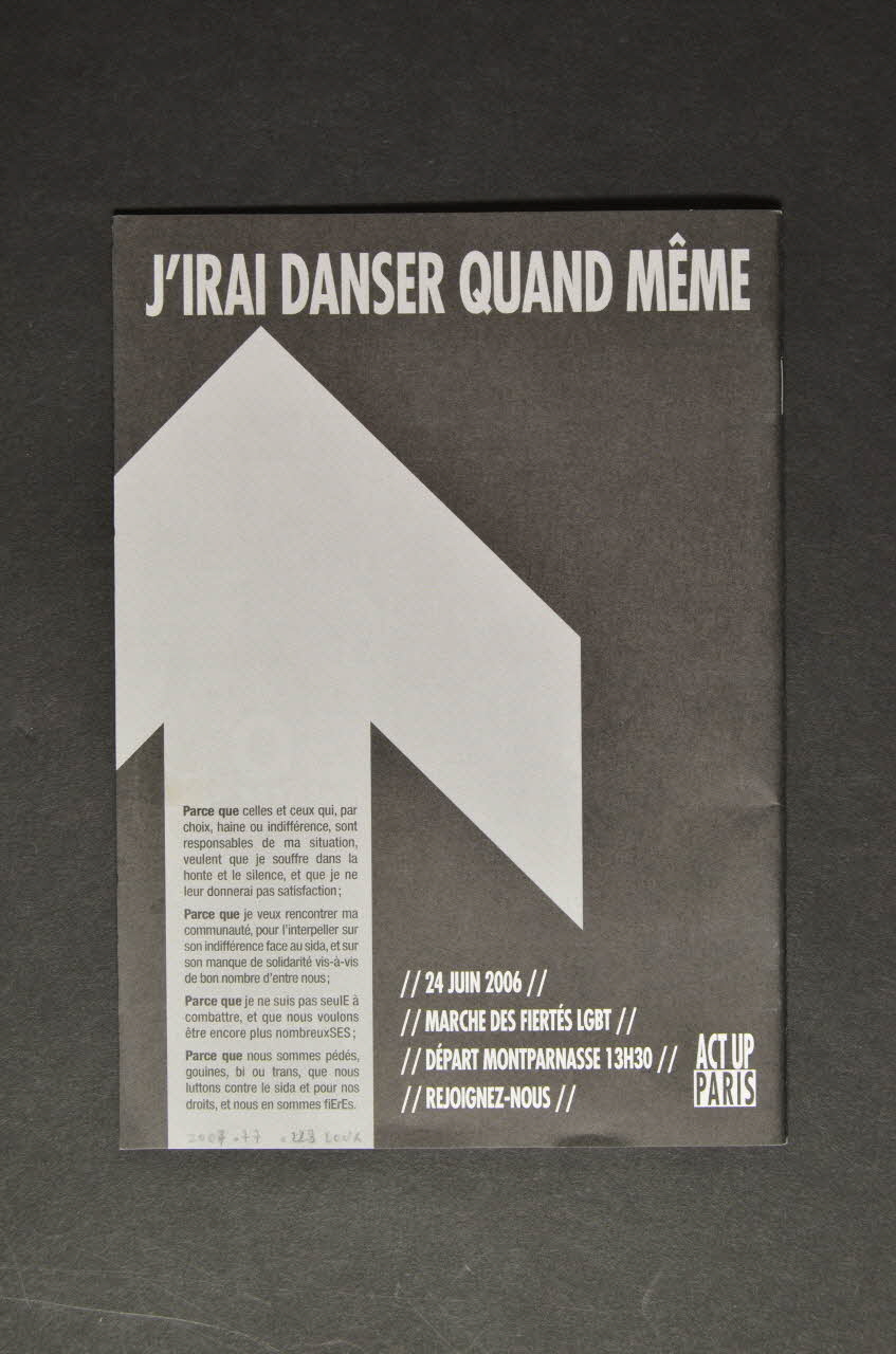 Même si séropo, précaire, je m'endette en payant de plus en plus, pour mes soins, parce que le gouvernement refuse d'augmenter les minima sociaux ; / Même si les administrations ne tiennent pas compte de ma maladie, des effets secondaires de mes traitements, des contraintes de ma prise en charge et de mon handicap ; Même si je me soigne mal parce que je vis dans une chambre d'hôtel depuis des années, sans que la Mairie de Paris ou la Préfecture de police ne s'en soucient ; Même si, lorsque je drague et je dis que je suis séropo, on me tourne trop souvent le dos ; Même si, homo ou trans persécutéE dans mon pays, je me vois refuser l'asile en France ; Même si la haine homophobe ou transphobe dans mon quartier, dans mon lycée ou sur mon lieu de travail m'inciterait à rester cachéE et honteusE ; Même si chez les gays et les trans, en France et dans le monde, le sida progresse continuellement ; Même si la communauté ne se mobilise pas assez contre une pandémie qui nous a déciméEs et qui continue ses ravages..., sur la couvertureParce que celles et ceux qui, par choix, haine ou indifférence, sont responsables de ma situation, veulent que je souffre dans la honte et le silence, et que je ne leur donnerai pas satisfaction ; / Parce que je veux rencontrer ma communauté, pour l'interpeller sur son indifférence face au sida, et sur son manque de solidarité vis-à-vis de bon nombre d'entre nous ; / Parce que je ne suis pas seulE à combattre, et que nous voulons être encore plus nombreuxSES ; / Parce que nous sommes pédés, gouines, bi ou trans, que nous luttons contre le sida et pour nos droits et nous en somes fiErEs., versodiscriminations / sida / précarité / effets secondaires / handicap / exclusion, sur la couvertureLogo, nom d'association