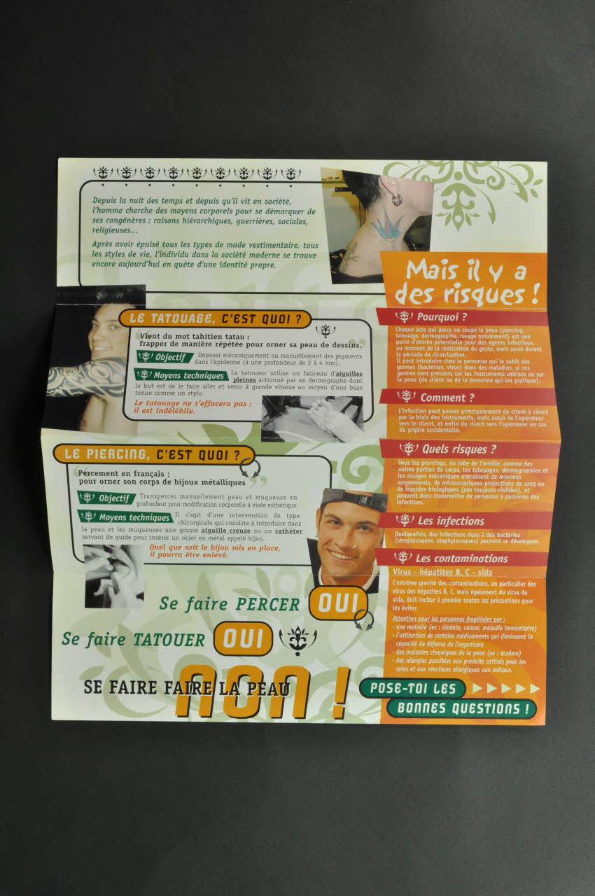 En sous impression il y a des dessins de volutes ton sur ton. En haut à gauche, sont dessinés des arabesques vertes. A droite, il y a une petite photo en couleur de la tête d'un jeune homme souriant avec plusieurs piercings.