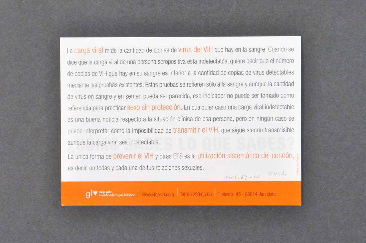 carte postale, "Con carga viral indetectable es mas dificil transmitir el VIH/Sida" (Avec une charge virale indétectable il est plus difficile de transmettre le VIH/SIda) / Como sabes lo que sabes ? (Comment sais tu ce que tu sais ?)