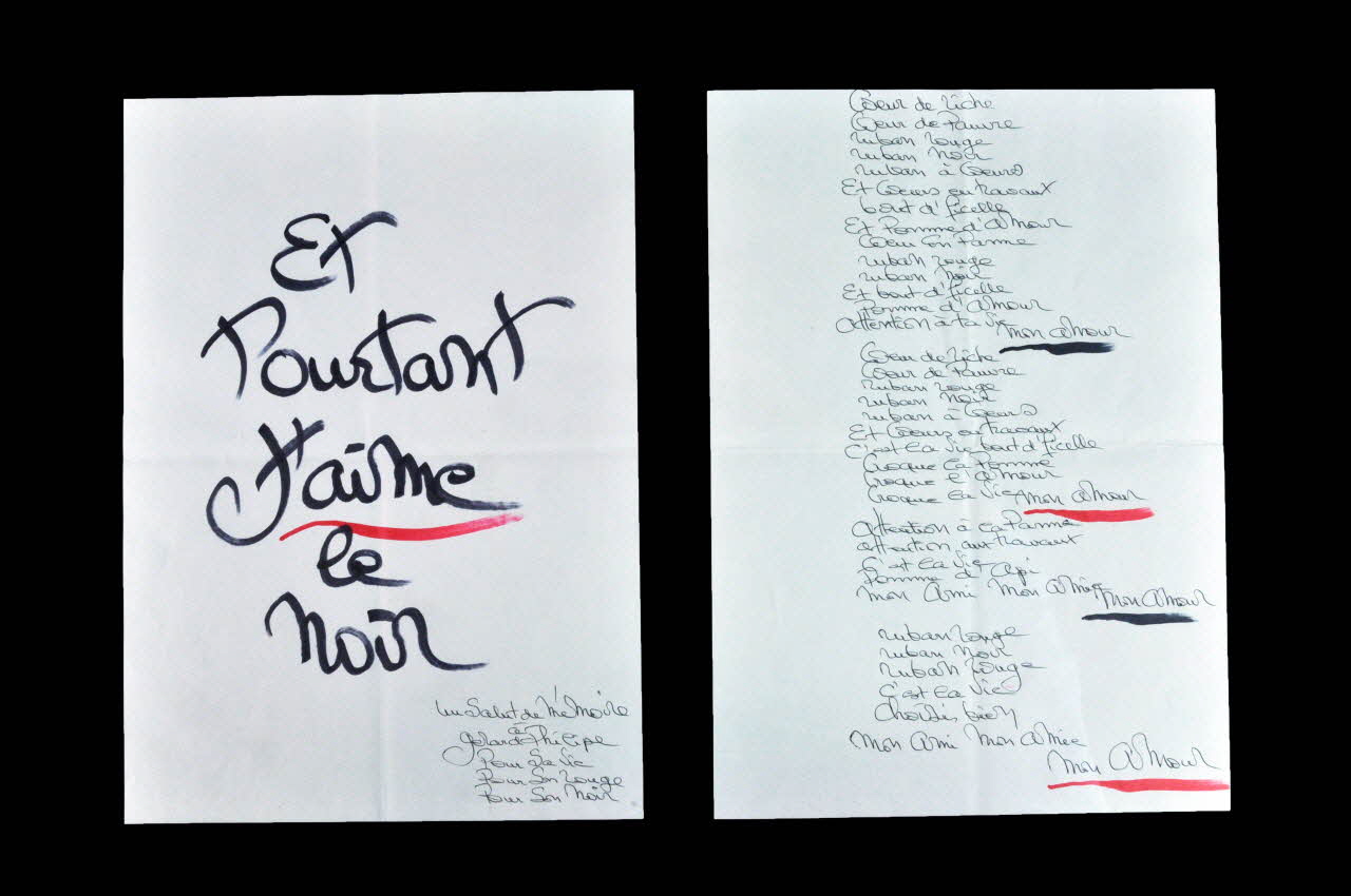 + un Petit / message / d'amour / *** (Sur l'enveloppe.)M'aime / Si d'amour / En amour / Si d'aventures / En aventures / il se faisait / qu'il y ait / mal d'aventure / Je t'aime / Je t'aimerais/ FrouFrou d'amour / (Sur le feuillet.)Et pourtant j'aime le noir / Un salut de mémoire à / Gérard Philippe / pour sa Vie / Pour son Rouge / Pour son Noir (Sur la feuille .2)Coeur de riche / Coeur de Pauvre / ruban rouge / ruban noir / ruban à coeurs / Et coeurs en travaux / bout d'ficelle / pomme d'amour / Attention à ta vie / Mon amour" (trait noir en dessous) // "Coeur de riche / Coeur de Pauvre / ruban rouge / ruban noir / ruban à coeurs / Et coeurs en travaux / C'est la vie bout d'ficelle / Croque la Pomme / Croque l'Amour / Croque la Vie / Mon Amour" (trait rouge en dessous) // "Attention à la Pomme / Attention aux travaux / C'est la Vie / Pomme d'Api / mon Ami, mon Amie / mon Amour" (trait noir en dessous) // Ruban rouge / ruban noir / Ruban rouge / C'est la vie / Choisis bien/ mon Ami, mon Amie / mon Amour (Poème sur la feuille .1)Matériaux et techniques