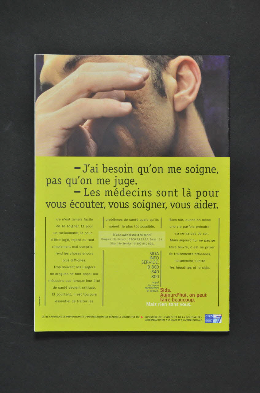 - J'ai besoin qu'on me soigne, pas qu'on me juge. // - Les médecins sont là pour vous écouter, vous soigner, vous aider. // Ce n'est jamais facile // de se soigner. Et pour // un toxicomane, la peur // d'être jugé, rejeté ou tout // simplement mal compris, // rend les choses encore // plus difficiles. // Trop souvent les usagers // de drogues ne font appel aux // médecins que lorsque leur état // de santé devient critique. // Et pourtant il est toujours // essentiel de traiter les // problèmes de santé quels qu'ils // soient, le plus tôt possible. // Bien sûr, quand on mène // une vie parfois précaire, // ça ne va pas de soi. // Mais aujourd'hui ne pas se // faire suivre, c'est se priver // de traitements efficaces, // notamment contre // les hépatites et le sida (texte en noir sur fond vert), versoDécor