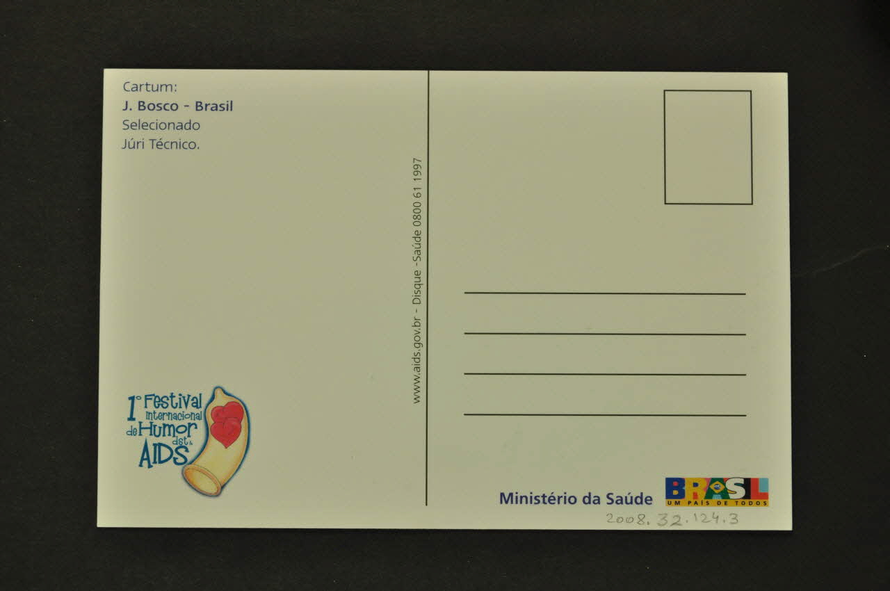 Ministério da Saúde BRASIL UM PAIS DE TODOS (en bas à droite), verso1° Festival // internacional // de Humor // dst & // AIDS (en bas à gauche, avec un dessin de deux coeurs dans un préservatif.), versoAdresse, date