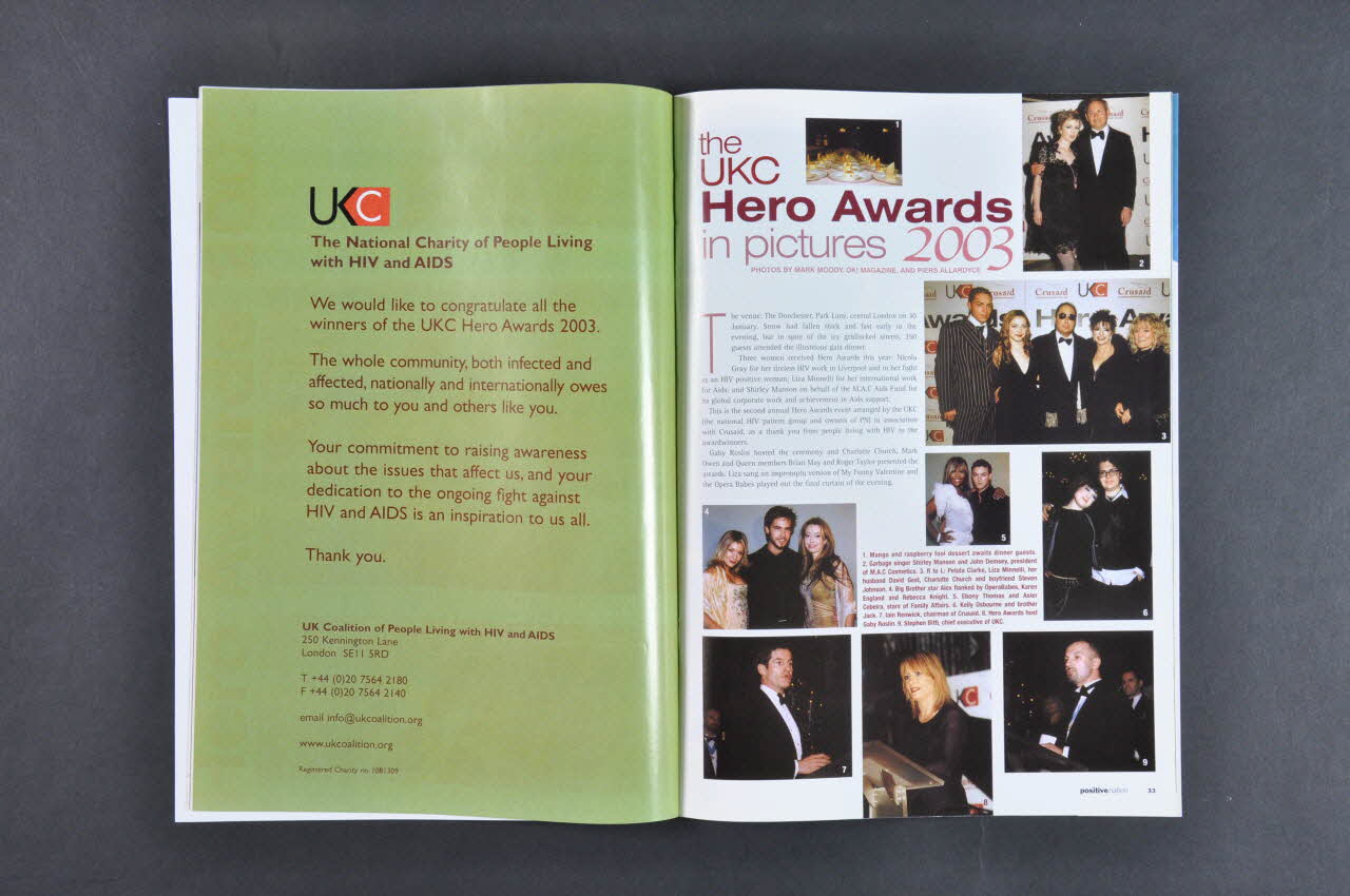 Cette revue en anglais est le numéro 88 de "Positive nation". Celle-ci est composée de soixante-six pages imprimées sur du papier glacé et reliées entre elles par deux agrafes. La couverture comprend une photographie couleur presque pleine page représentant Lizza Minnelli en robe noire recevant un prix. Le fond est globalement noir. Le nom de la revue et le titre de l'exemplaire sont imprimés dans la partie supérieure. La date et le numéro de la revue sont imprimés en petits caractères verticalement sur la gauche. Enfin, un logo est présent dans le bas. Le dos comprend également une photographie couleur pleine page d'un groupe composé de deux femmes et de trois hommes assis dans l'herbe. Du texte est imprimé dans le bas ; un logo se trouvre dans le haut à droite. Un sommaire est imprimé en page trois sur une colonne à gauche ; à droite se trouve une série de photographies illustrant différents articles. Les pages sont imprimées, le plus souvent, en noir sur blanc. Certaines pages comprennent des encarts publicitaires, des photographies (en vignettes ou pleine page), des encadrés... Chaque article est traité différemment. Les pages sont numérotées et on retrouve dans le bas de chacune le nom de la revue.Inscriptions