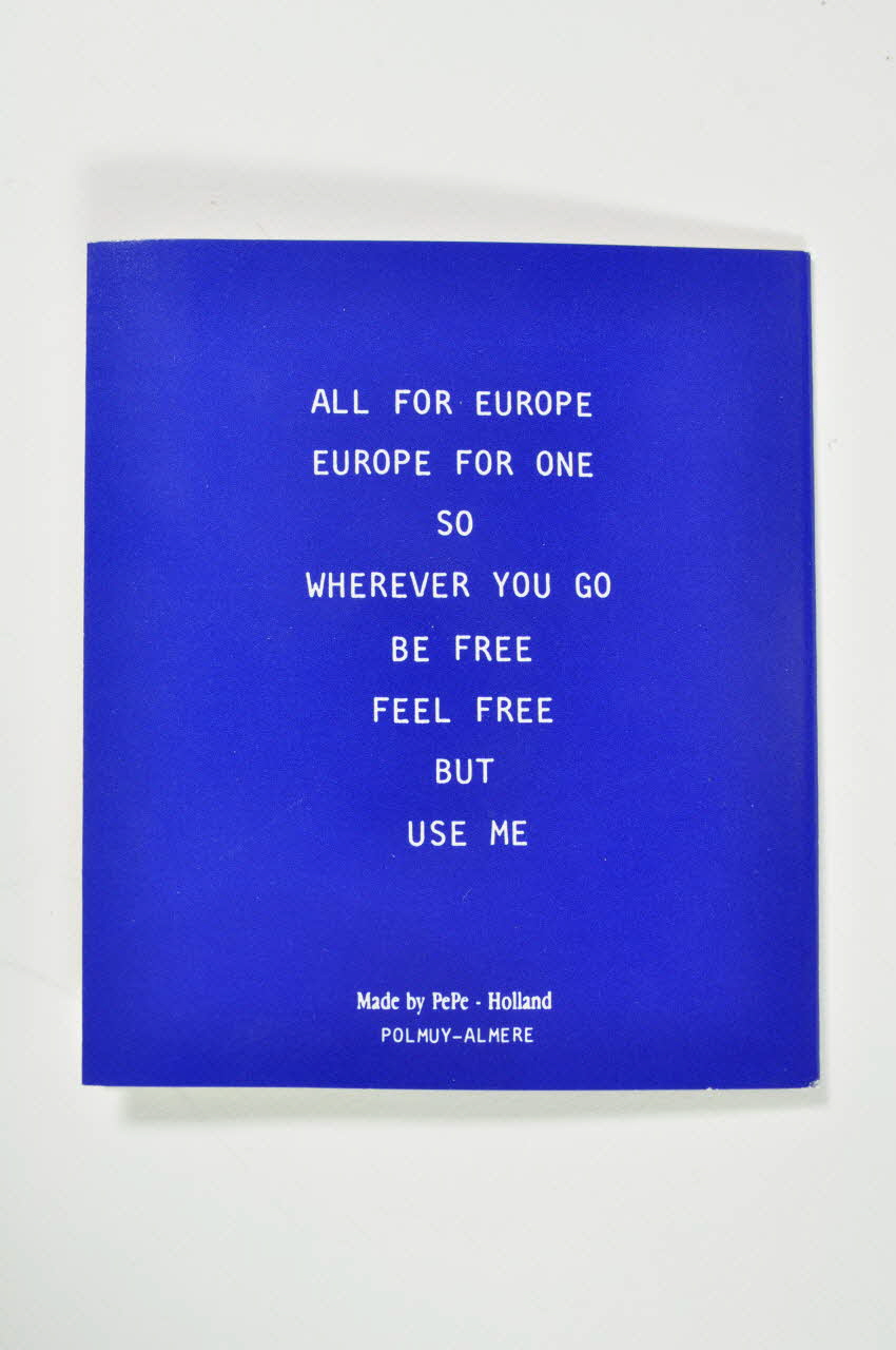 Grand dépliant à deux rabats en carton, l'étui contient un préservatif non lubrifié à l'intérieur du volet droit. Le recto présente en son centre, sur fond bleu, dix-neuf étoiles rappelant le drapeau européen. En bas du sigle se trouve une inscription en lettres capitales jaunes. Au verso du dépliant, une écriture en lettres capitales blanches se détache sur un fond bleu. A l'intérieur, le fond blanc est couvert d'impressions bleues. Sur le volet gauche sont indiquées les principales capitales européennes et deux autres extra-européennes, avec le nom donné au préservatif dans la langue de chacune d'elles. Sur le volet droit, en travers, est aposé le tampon de passeport européen avec le drapeau européen au centre, d'où s'échappe le préservatif. Dans le coin inférieur droit se trouve une inscription.Inscriptions