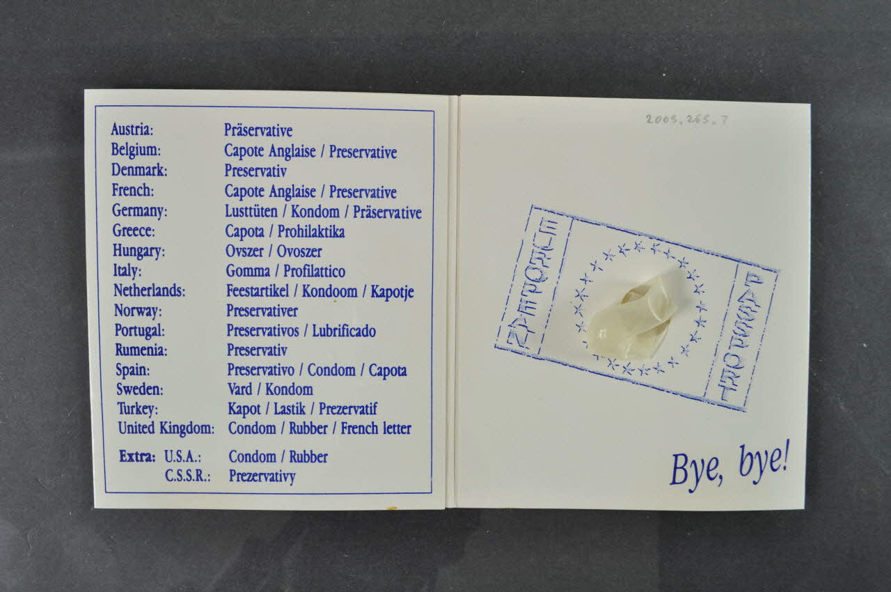 Capote anglaise / Preservative (Sur le volet gauche, en lettres bleues sur fond blanc. // Retranscription en français uniquement, dans la transcription.), à l'intérieurALL FOR EUROPE // EUROPE FOR ONE // SO // WHEREVER YOU GO // BE FREE // FEEL FREE // BUT // USE ME (Inscription en lettres capitales blanches sur fond bleu, répartie sur huit lignes.), versoBye, bye! (Sur le volet droit, dans le coin inférieur droit. Inscription en lettres bleues sur fond blanc.), à l'intérieurConcernant le lieu d'édition