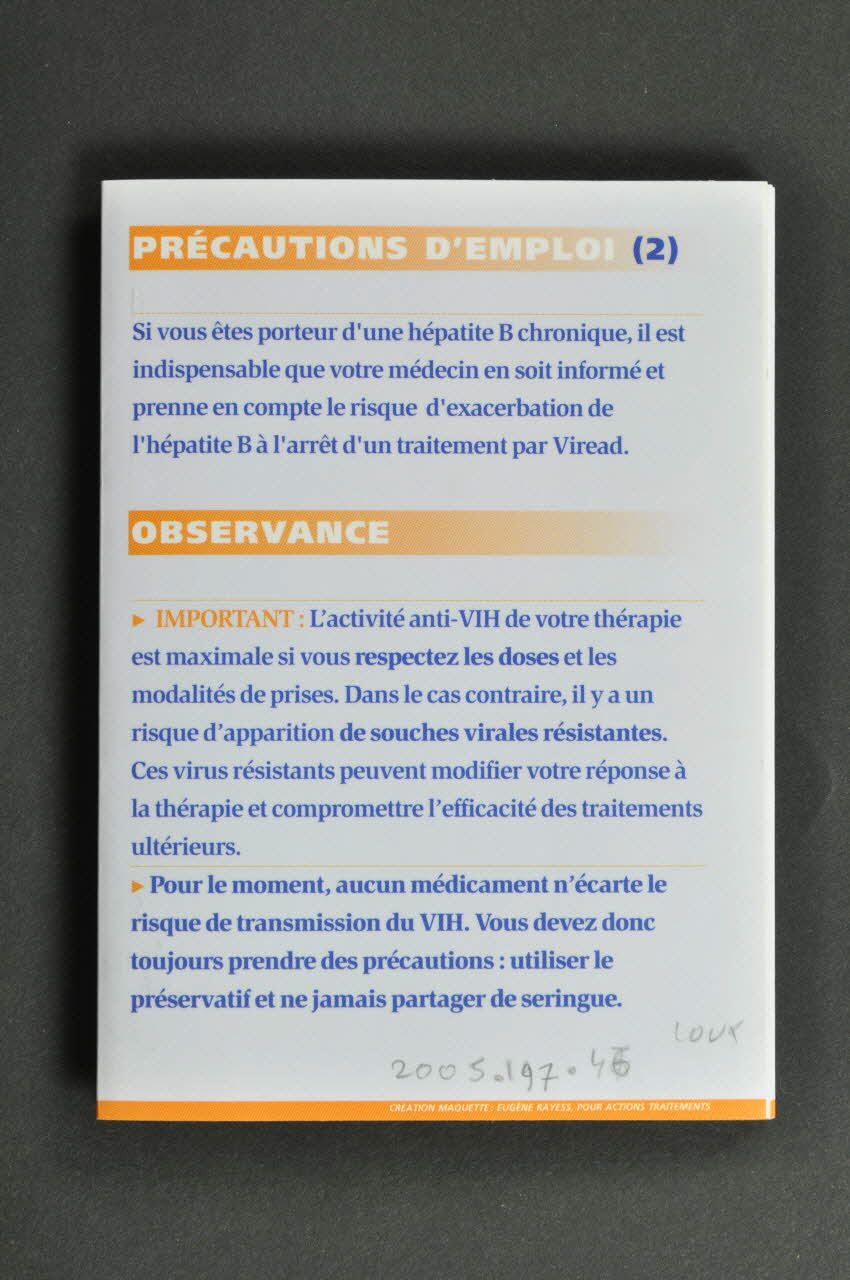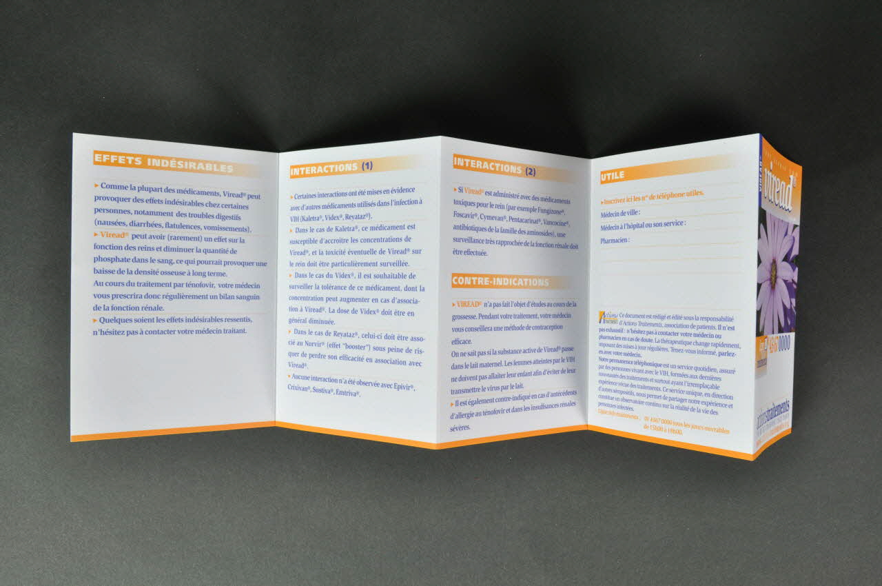TOUT SAVOIR SUR // viread® // AOUT 2004 (Sur le bandeau orange en lettres blanches.), rectoFICHE SIGNALETIQUE // QU'EST-CE AUE VIREAD? // UTILISATION // EFFETS BENEFIQUES // CONSERVATION // PRECAUTIONS D'EMPLOI // OBSERVANCE // EFFETS INDESIRABLES // INTERACTIONS // CONTRE-INDICATIONS // UTILE (Les sous-titres en lettres blanches sur les petits bandeaux oranges.), à l'intérieuractionstraitements // 190 BD DE CHARONNE 75020 PARIS // www.actions-traitements.org (En lettres bleues et oranges dessus du petit bandeau orange inférieur.), rectoCe document est rédigé et édité sous la responsabilité d'Actions Traitements, association de patients. Il n'est // pas exhaustif : n'hésitez pas à contacter votre médecin ou pharmacien en cas de doute. La thérapeutique change rapidement, // imposant des mises à jour régulières. Tenez-vous informé, parlez- // en avec votre médecin. // Notre permanence téléphonique est un service quotidien, assuré // par des personnes vivant avec le VIH, formées aux dernières // nouveautés des traitements et surtout ayant l'irremplaçable expérience vécue des traitements. Ce service unique, en direction // d'autres séropositifs, nous permet de partager notre expérience et // constitue un observatoire continu sur la réalité de la vie des // personnes infectées. (A la fin du dernier feuillet, en lettres bleues.), à l'intérieurMarque