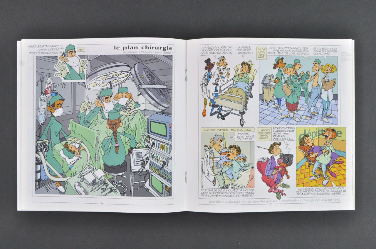 - Le plan transfusion page 6 // - Le plan piercing page 8 // - Le plan tatouage page 10 // - Le plan esthétique page 12 // - Le plan acupuncture page 14 // - Le plan toxicomanie page 16 // - Le plan snif page 18 // - Le plan chirurgie page 20 // - Le plan famille page 22 // - Le plan taule page 24 // - Le plan dialyse page 26 // - Le plan endémie page 28 // - Le plan bébé page 30 // - Premiers secours page 32 // - Le plan traitement page 34" // - Le plan sexe page 36 // - Le plan cool page 38 (Imprimé en noir sur blanc sur la page 1), à l'intérieurConcernant le lieu d'impression
