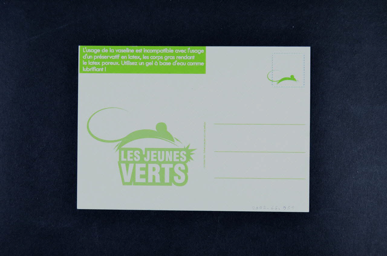 Le recto se lit dans le sens vertical. Il présente sur un fond blanc la photographie d'un pot de vaseline avec un couvercle vert précédé par un texte en grands caractères noirs. Dans la partie inférieure, se trouvent, sur un bandeau vert, un slogan, l'adresse internet et le logo du parti politique: une souris verte. Le verso laisse de l'espace pour la correspondance sur fond blanc. Dans la partie supérieure droite, il y a un texte sur un bandeau vert. Le logo est en vert au centre de la partie droite.Inscriptions