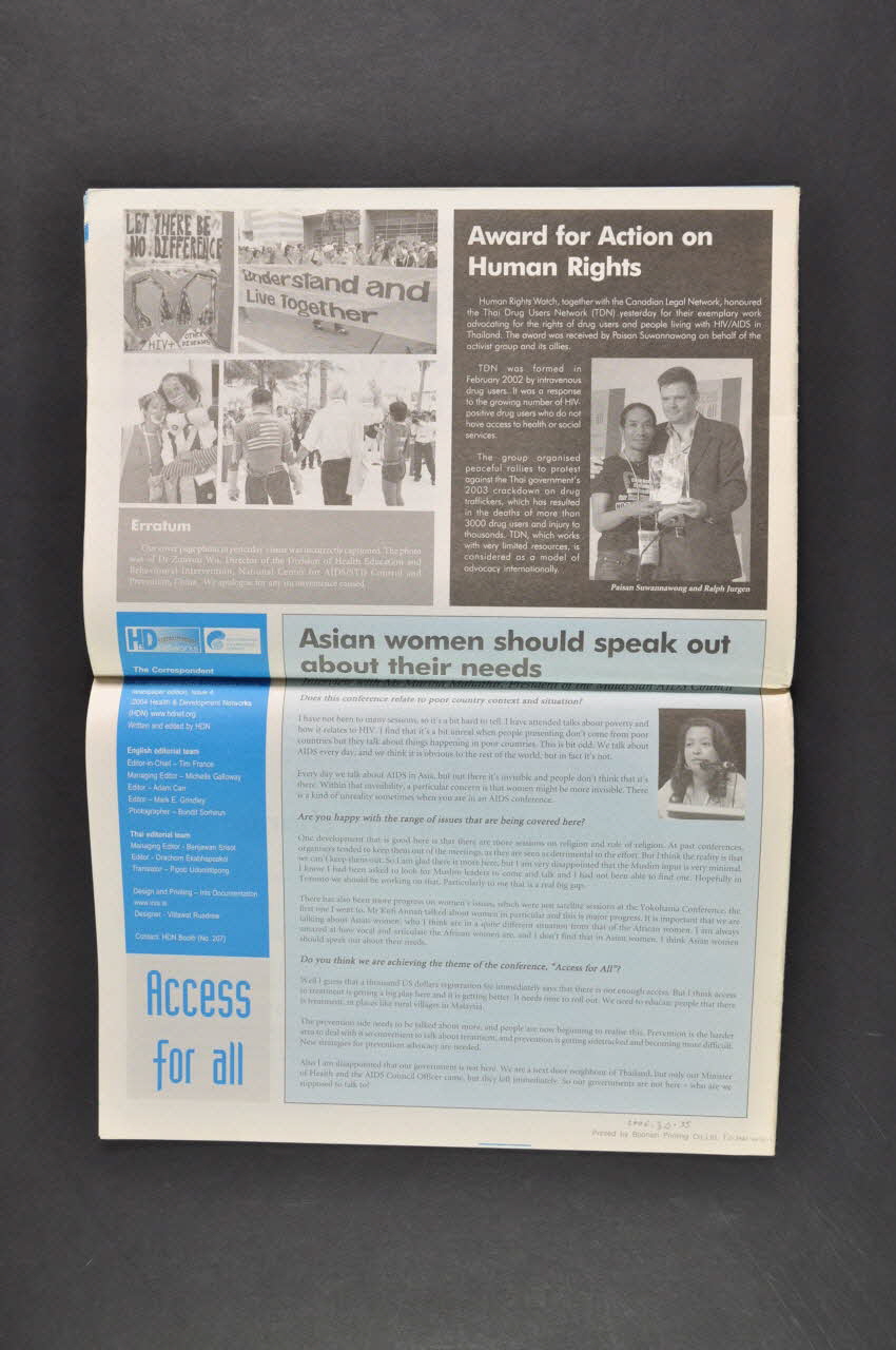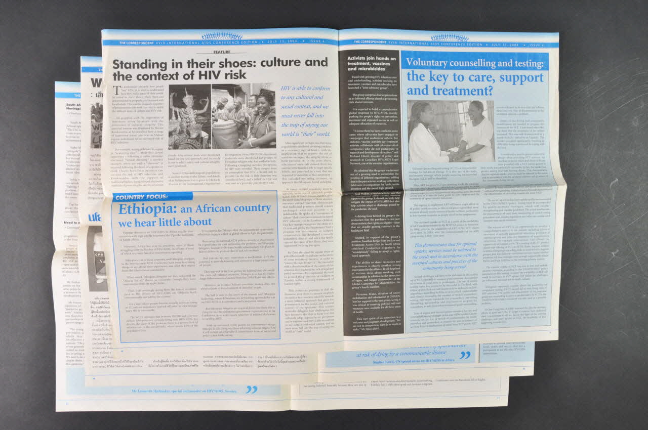 Couverture. En haut , en capitales noires : "The Correspondent". A gauche, le logo de la conférence. En dessous, sur bandeau vert : la date : 15 juillet 2004. N°4. Edition en anglais et en thailandais Photos noir et blanc, en particulier de manifestations Pages 1 et 2. La prévention de la transmission mère enfant en Afrique du Sud Pages 1 et 2. S'engager avec les jeunes et non pour les jeunes Page 3. Conférence du Mémorial Jonathan Mann / Dennis Altman : Beaucoup de raisons pour être en colère Page 3. Promouvoir l'adhérence au traitement Pages 4 et 5 Articles en thai Page 6. Le risque de contamination et les questions culturelles Page 7 Le counselling au dépistage Page 8. Les jeunes à la conférence Page 9 Le fardeau sur les femmes des soins à domicile Page 10 L'accès de tous aux traitements et aux soins : encore des progrès à faire Page 11 Prix pour des actions sur les droits de l'homme remis à Paisan Suwannawong pour le Thai Drud Users Network Revue distribuée tous les jours à la conférence. Bonne information, photos, informations sur manifestations, contestations.