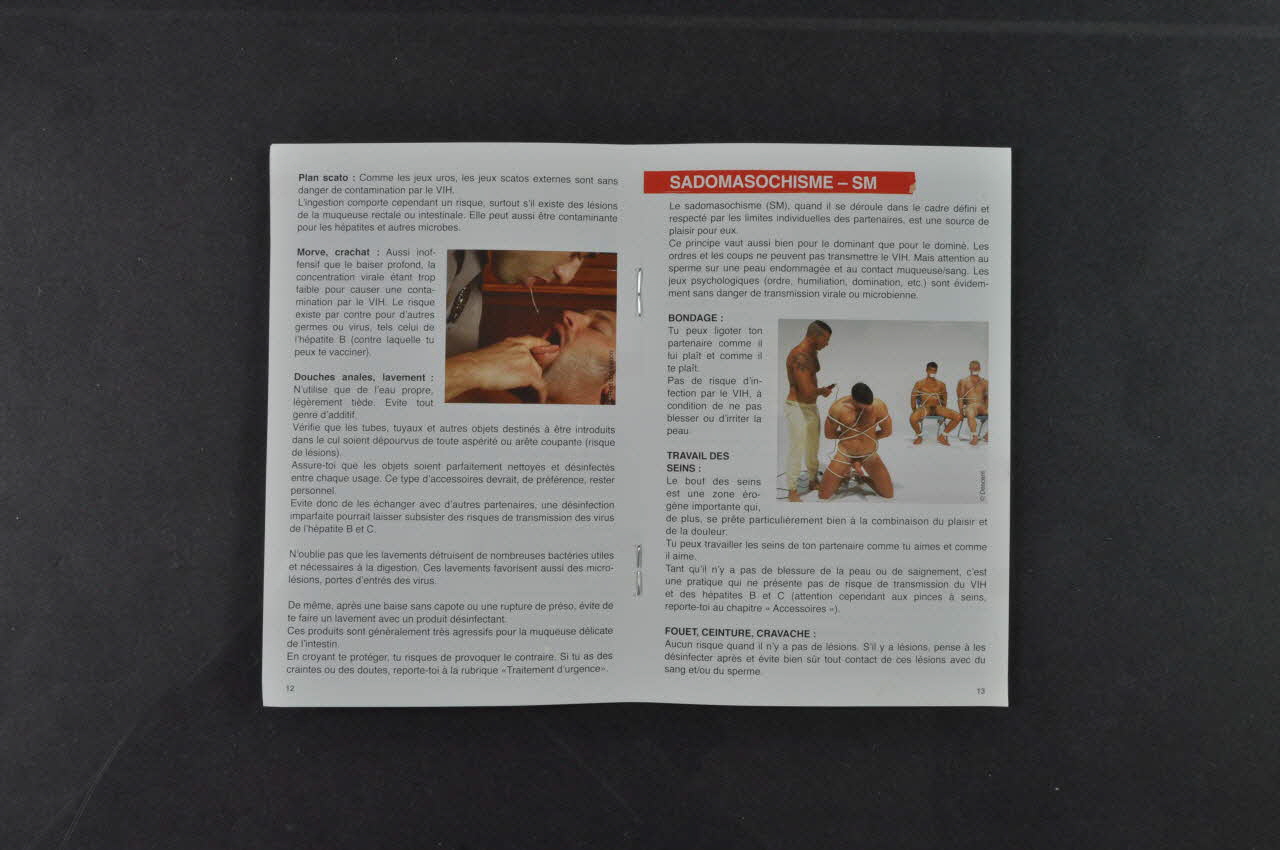 - Présentation de la brochure : Cette "plaquette s'adresse à des hommes ayant des relations hard ou sado-masochistes (SM) avec d'autres hommes. / Quelles que soient les pratiques, librement consenties, qui sont abordées ici, il est important de rappeler qu'elles se déroulent dans le cadre d'un respect total mutuel et d'une entière confiance entre les partenaires. / Le fait d'être séropositif ou malade du sida n'est en aucune façon une raison de renoncer à la construction de projets, de vivre une vie sexuelle et affective épanouissante. Séropositif ou séronégatif, à chacun de prendre en charge sa sexualité vis-à-vis des autres. / L'objectif recherché par cette brochure est d'informer afin de rendre chacun acteur de sa prévention, de se protéger et de protéger les autres, et ce, le mieux possible. / L'esprit de ce document n'est pas d'imposer des règles, mais de permettre à chacun de trouver les informations nécessaires pour rester safe dans ses pratiques sexuelles hard."