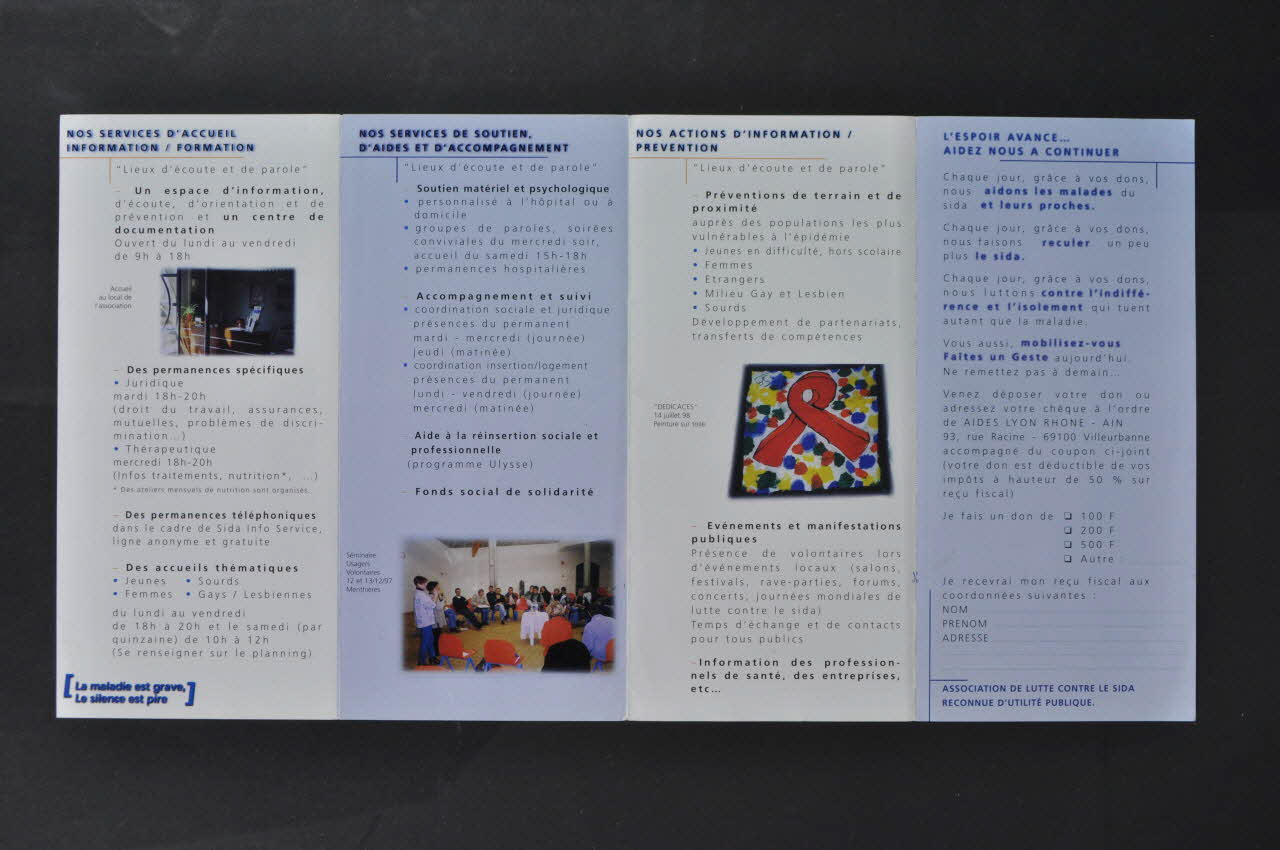 La couverture se compose d'une photographie couleur d'une partie d'un visage de femme : oeil gauche bleu regardant vers le bas. En bas, une zone blanche porte le logo de l'association. Un texte est écrit sur la zone de droite de l'image. L'intérieur contient des textes sur fonds blancs et bleus, illustrés de photographies : accueil de l'association, séminaire, tableau avec ruban rouge. A l'arrière se trouvent les coordonnées de deux pôles de l'association et le plan d'accès du premier.Inscriptions
