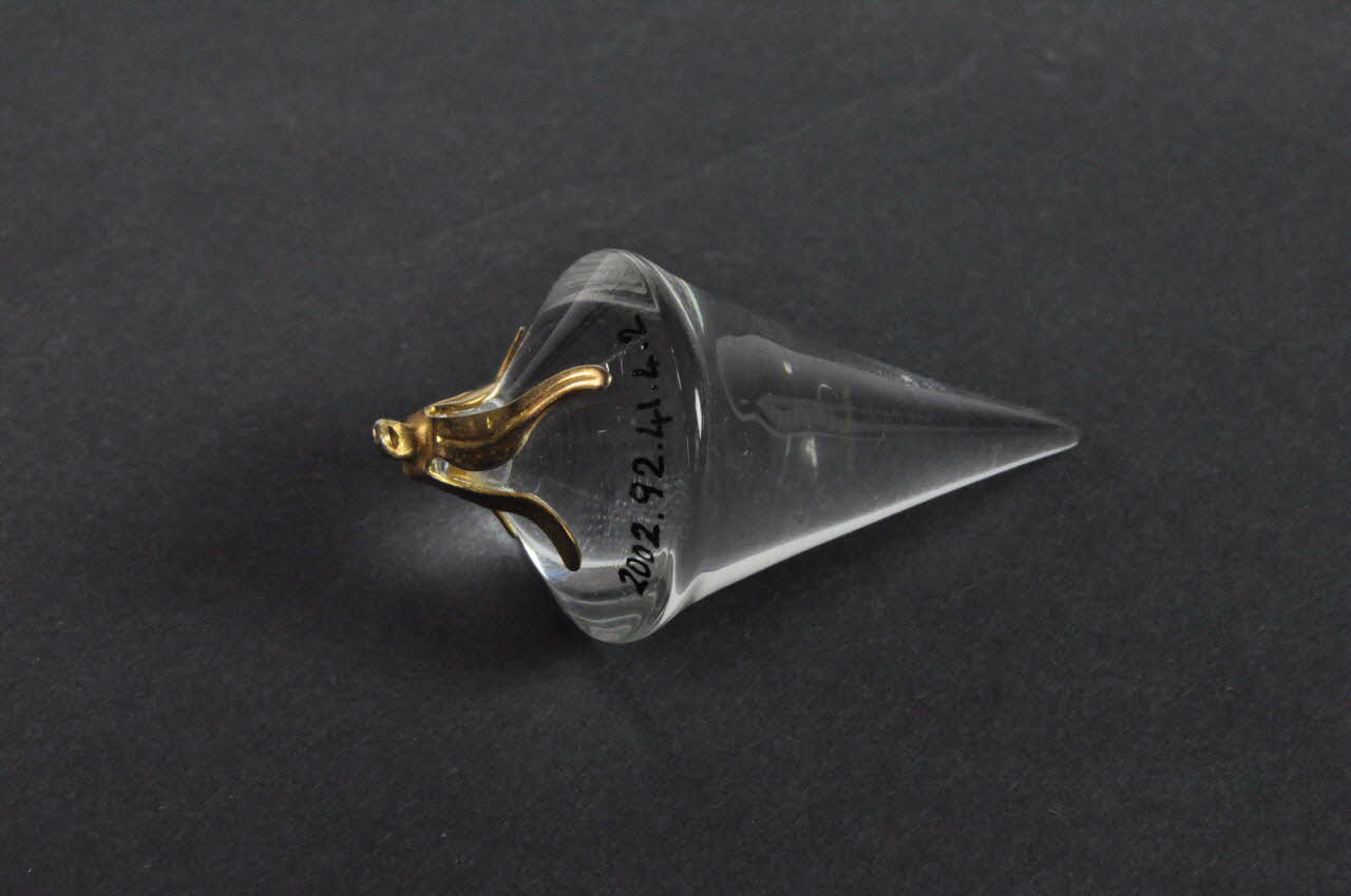 Pendule en verre transparent de forme tronconique avec une monture en métal doré collée dessus. La monture possède un anneau et quatre feuilles ciselées.
