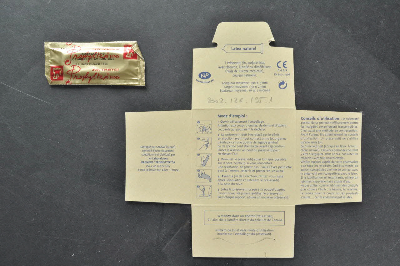 Prophyltex® FINSFace au sida, chacun d'entre nous doit se protéger, protéger les autres et adopter des attitudes de prévention. Pour répondre à toutes vos questions 24/24h, 7 jours sur 7, Sida Info Service 0 800 840 800 (appel anonyme, confidentiel et gratuit) », versoLatex naturel/ Préservatif fin, surface lisse, avec réservoir, lubrifié au diméthicone/(huile de silicone médicale), /couleur naturelle./ longueur moyenne 190 +-5 mm/ largeur moyenne 52 +-2mm/ épaisseur moyenne 65 +_5 microns (Logos NF et CE), intérieurMode d'emploi 1. Ouvrir délicatement l'emballage. attention aux coups d'ongles, de dents et d'objets coupants qui pourraient le déchirer/ 2.Le préservatif doit être placé sur le pénis en érection avant tout contact entre les organes génitaux car une goutte de liquide séminal ou de sperme peut être libérée avant l'éjaculation. Pincez le réservoir au bout du préservatif pour en chasser l'air. / 3. Déroulez le préservatif ausi loin que possible sur le sexe. Surtout, si vous rencontrez une résistance, ne forcez pas : vous l'avez peut être posé à l'envers, jetez-le et prenez-en un autre. /4. Avant la fin de l'érection, retirez vous juste après l'éjaculation en retenant le préservatif à la base du sexe. /5. Jetez le préservatif usagé à la poubelle après l'avoir noué. Ne jamais réutiliser le préservatif. pour chaque rapport, utiliser un nouveau préservatif. (avec petits schémas pour chacune des phases), au milieuA stocker dans un endroit frais et sec, à l'abri de la lumière directe du soleil et de l'ozone./ Numéro de lot et date limite d'utilisation inscrits sur l'emballage du préservatif., en basFabriqué par SAGAMI (Japon), contrôlé électroniquement, conditionné et distribué par les Laboratoires RADIATEX "PROPHYLTEX" SA (adresse), à gaucheConseils d'utilisation : Le préservatif permet de se munir efficacement contre les maladies sexuellement transmissibles. C'est aussi une méthode de contraception. Avant l'usage, lire attentivement les conseils dutilisation.Un préservatif ne s'utilise qu'une seule fois. / Ce préservatif est fabriqué en latex (caoutchouc naturel). Certaines personnes peuvent y être allergiques. Dans ce cas, consulter un médecin avant tout nouvel emploi. / Vérifier toujours auprès de votre pharmacienque tous les produits (médicaments ou autres) susceptibles d'entrer en contact avec le préservatif sont compatibles avec le latex. Si la lubrification est insuffisante, utiliser un lubrifiant supplémentaire à base d'eau. / Ne pas utiliser comme lubrifiant des produits gras comme l'huile, le beurre, la vaseline, la crème pour le corps ou les produits solaires... car ils endommagent le latex., à droiteProphyltex avec réservoir; et au dos : Lot, en août 1996 Ut av Juin 2005Décor