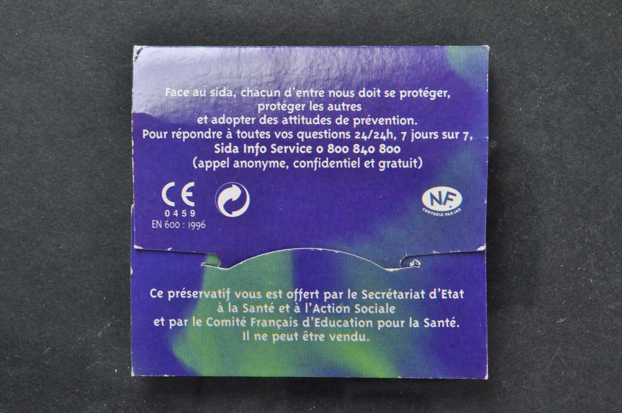 Cette pochette contient un préservatif Prophyltex, rectoprotégez-vous du / Sida / Aujourd'hui, on peut / faire beaucoup. / Mais rien sans vous. / protégez les autres, rectoDate