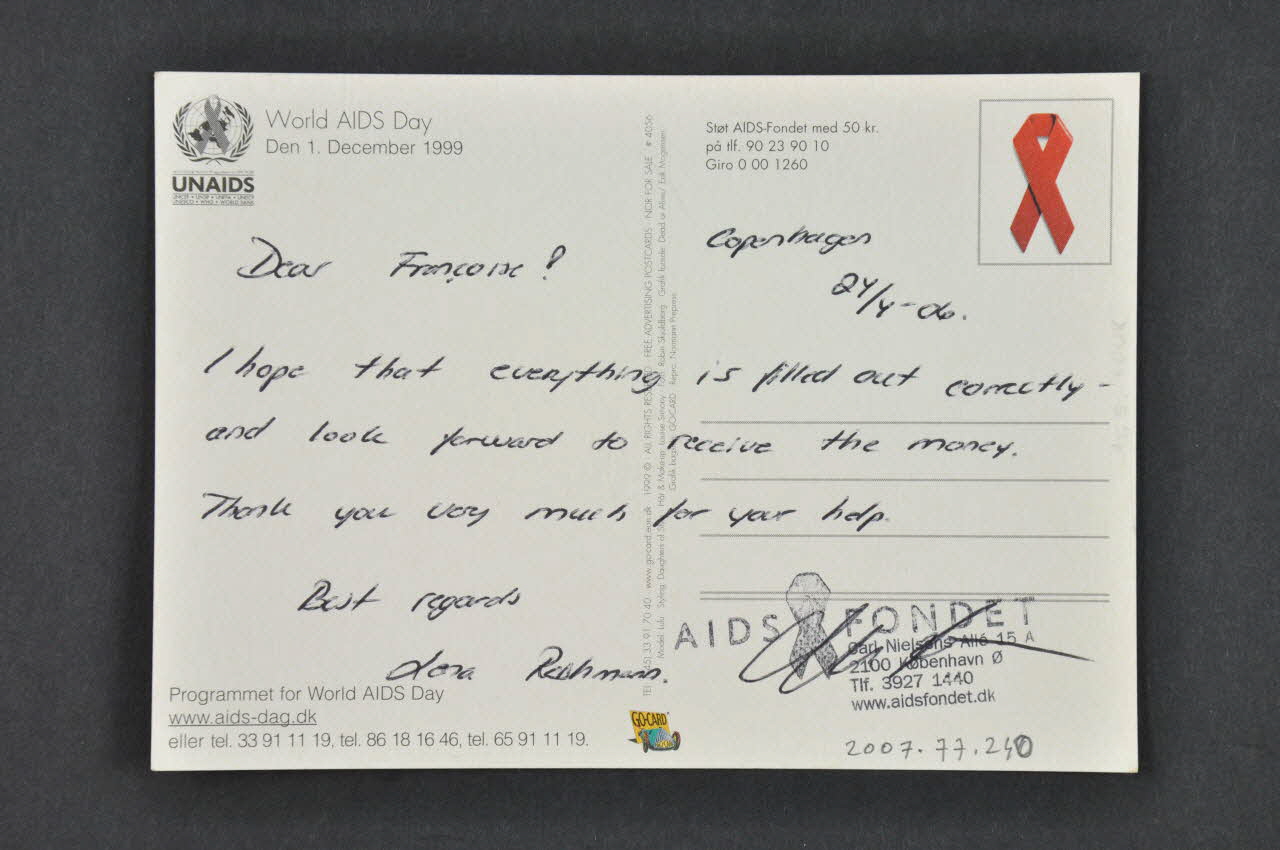 Dear Françoise! Copenhagen21/1-06 // I hope that everything is find out correctly and look forward to receive the money. // Thank you very much for your help. // Best regards // Lora Rohman (Le texte est manuscrit, marqué au stylo à bille bleue.), versoLogo, nom d'association