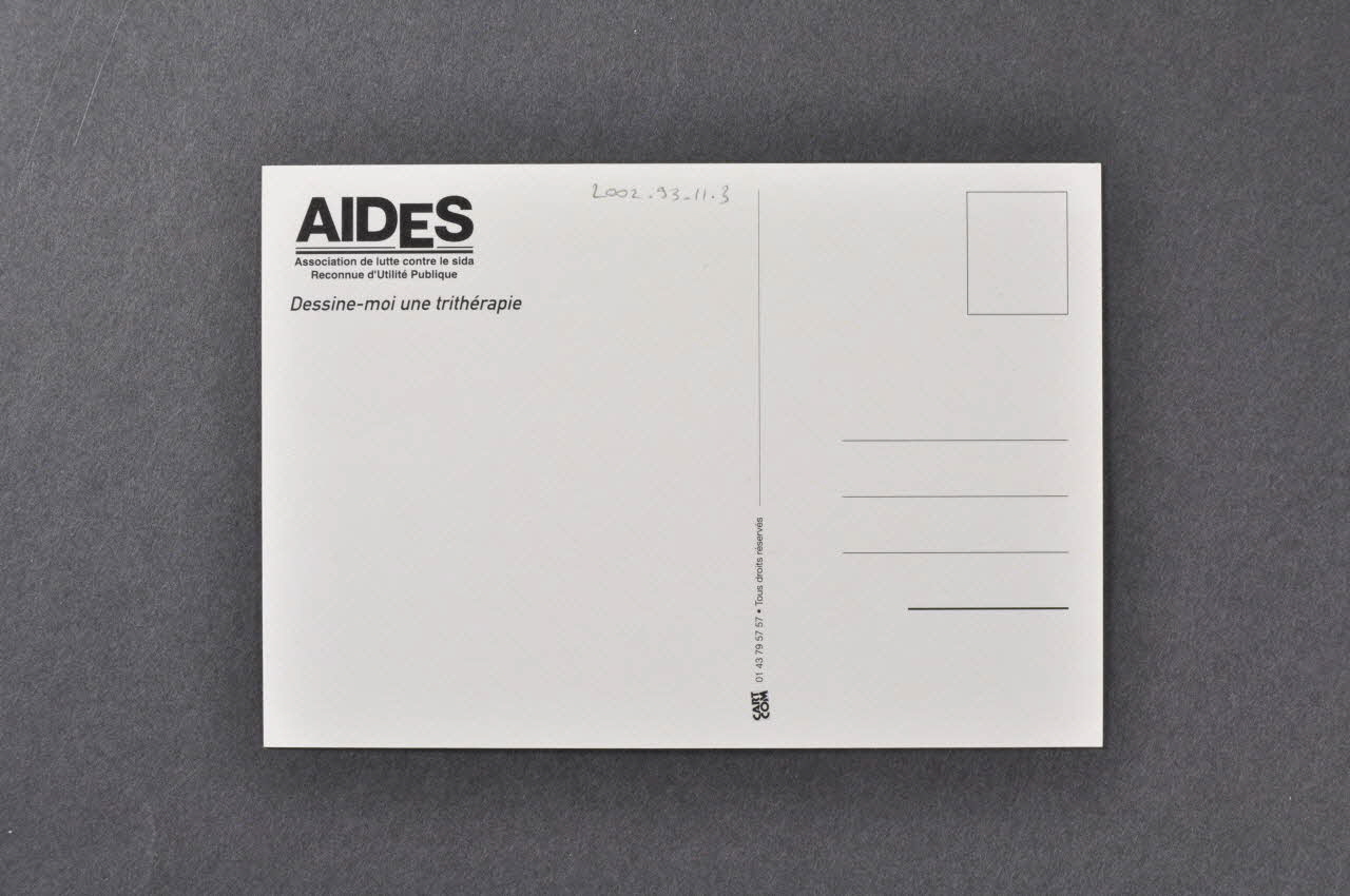 AIDES // Association de lutte contre le sida // Reconnue d'Utilité Publique // // Dessine-moi une trithérapie (angle supérieur gauche), versoSignature, auteur