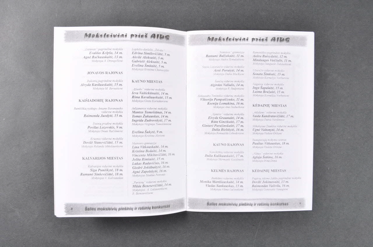 Il s'agit de la liste des résultats d'un concours de dessins sur le sida organisé en 2001 par l'association auprès de trois groupes d'écoliers et lycéens de 9 ans, de 10 à 14 ans et de 15 à 18 ans. Reproduction, en noir, de six des dessins.