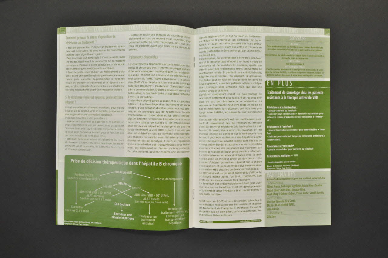 - p.2 à 6. Rubrique : Vivre avec le VIH : "Tempêtes sous un crâne" : (troubles cognitifs, vieillissement) - p.3 Suite de l'éditorial (sur fond gris vert) - p.5 Petit encadré en blanc sur fond vert : "Appel à témoins. Sport et VIH". - p.6 à 9. Rubrique : Co-infections : "Traitement de l'hépatite B chronique. Vers moins de résistances virales." - p.10-11. Rubrique : Prise en charge : "Le téléphone peut-il soigner ?" (lignes d'écoute sur les hépatites) - p.12-13. Rubrique : Actualité : "Un dépistage du VIH plus efficace : Des propositions du CNS... à suivre ?" - p. 14-15 Rubrique : Lu, vu, entendu... - p.16 (dos) Rubrique : Ce que j'en pense... : "Dossier médical personnel (DMP) : ça s'enlise". Bulletin d'abonnement