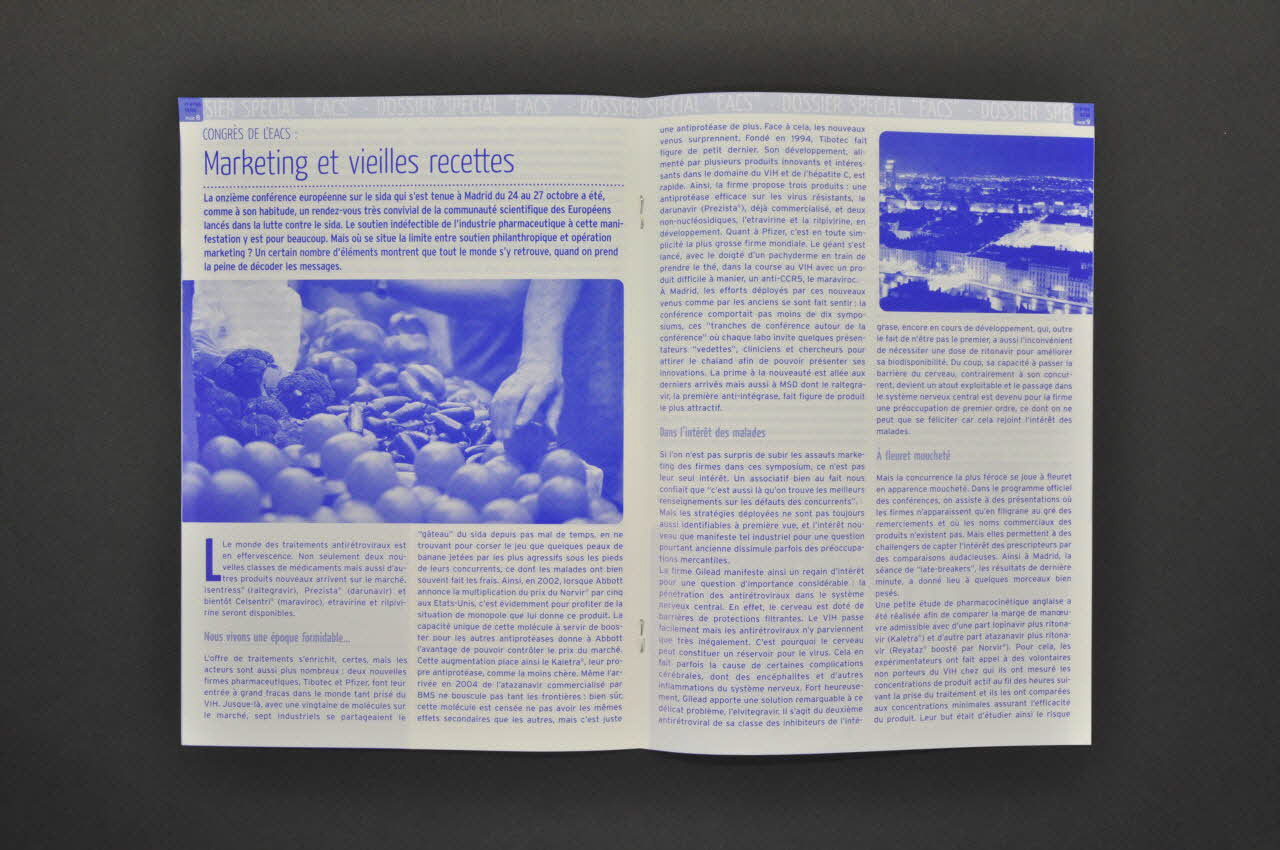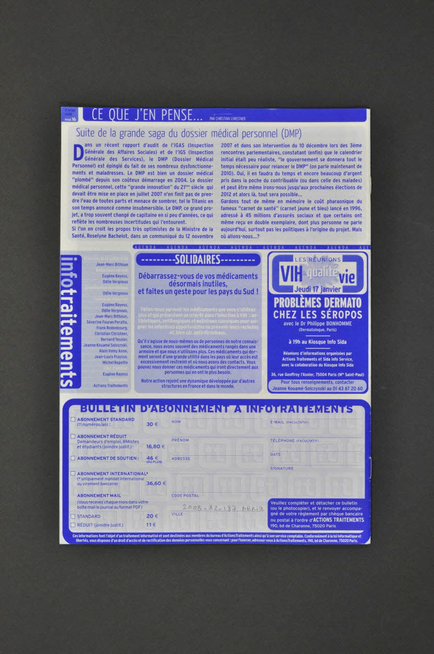 page 2. Actualité thérapeutique: l'embarras du choix // page 5. Vieillir avec le VIH: Attention à nos reins! // page 8. Congrès de l'EAC: Marketing et vieilles recettes // page 11. Tests rapides en France: Quel destin? // page 14. Lu, Vu, Entendu... // page 16. Ce que j'en pense: Dossier Médical Personnel, suite de la saga (Sur un bandeau bleu, dans la partie inférieure), sur la couvertureAdresse
