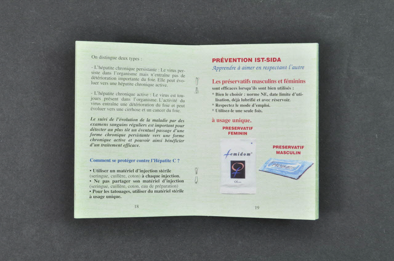 La couverture est rose avec des taxtes en bleu, un ruban rouge dans lequel passe une ribambelle de personnages. En bas à droite se trouve un logo rectangulaire rose et vert. A l'intérieur, les pages sont à fond vert avec des textes noirs avec des titres en rouge ou en vert. Quelques photos de préservatifs et de colliers sont présents. Plusieurs pages présentent des listes de numéros de téléphone. Sur la couverture arrière se trouve le même motif que sur la couverture avant avec un cadre blanc en partie basse.Inscriptions