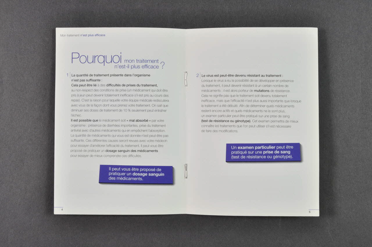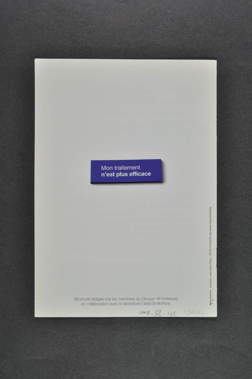 Brochure rédigée par les membres du Groupe VIH Initiatives en collaboration avec le laboratoire GlaxoSmithKline (En bas, en noir :), verso"Mon" / "efficace" / "enceinte" / antirétroviral" / "changé" / "doser" / "souhaite" / "le virus" / " pourquoi" / "débute" / "quand" / corps", sur la couvertureSommaire