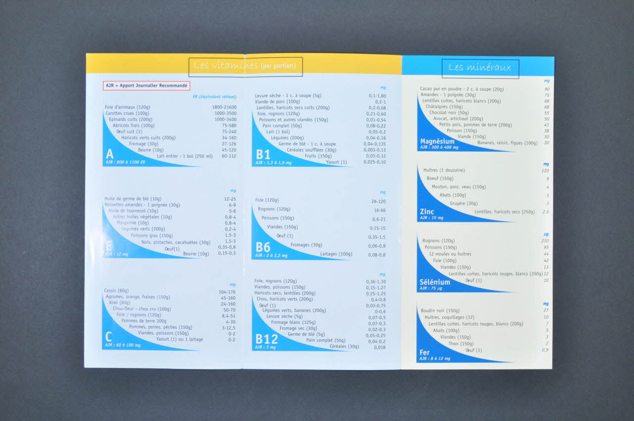 Sur la couverture, le tiers supérieur est en bleu et le bas est en jaune clair. En haut on trouve en blanc le titre et un sous-titre. En dessous, sur fond jaune, il y a le dessin d'un jeune homme jonglant avec des noms de vitamines dans des balles multicolores. En bas on trouve le nom et le logo de l'association et ses coordonnées à Lyon. Au dos il y a les noms des auteurs et le nom de la collection. Dessous on trouve les coordonnées de l'association et son adresse internet. Verticalement à droite on trouve la date de parution de la plaquette. A l'intérieur sur fond jaune on trouve un texte sur les besoins de bien se nourrir. Sur les autres volets on trouve une liste de produits répartis par vitamine. Pour chaque vitamine est noté l'apport Journalier Recommandé et les portions alimentaires avec quantité : Vitamine A (AJR 800 à 1100 ER (équivalent rétinol) ); E (12 mg); C (AJR 60 à 100mg); B1 (AJR : 1,3 à 1,5 mg); B6 (AJR : 2 à 2,2 mg); B12 (AJR 3mg). Pareil pour les minéraux : Magnesium (300 à 400 mg); Zinc (15 mg); Sélénium (75 microg); Fer (8 à 12 mg).Inscriptions