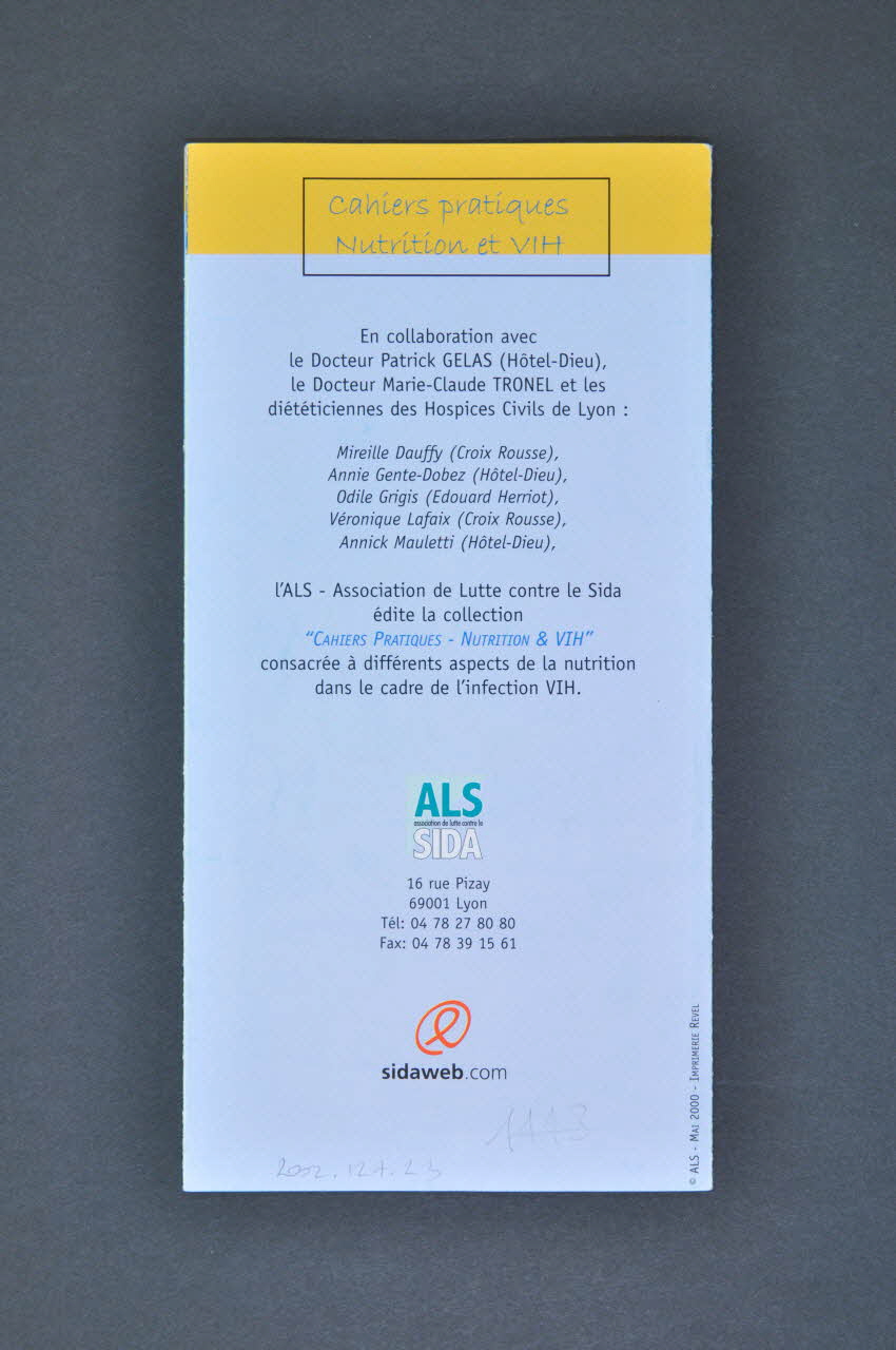 En collaboration avec le Dr Patrick GELAS (Hôtel Dieu), le Dr Marie-Claude TRONEL et les diététiciennes des hospices civils de Lyon., versoLogo, adresse, nom d'association