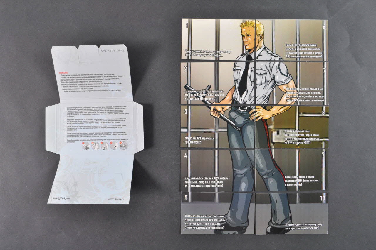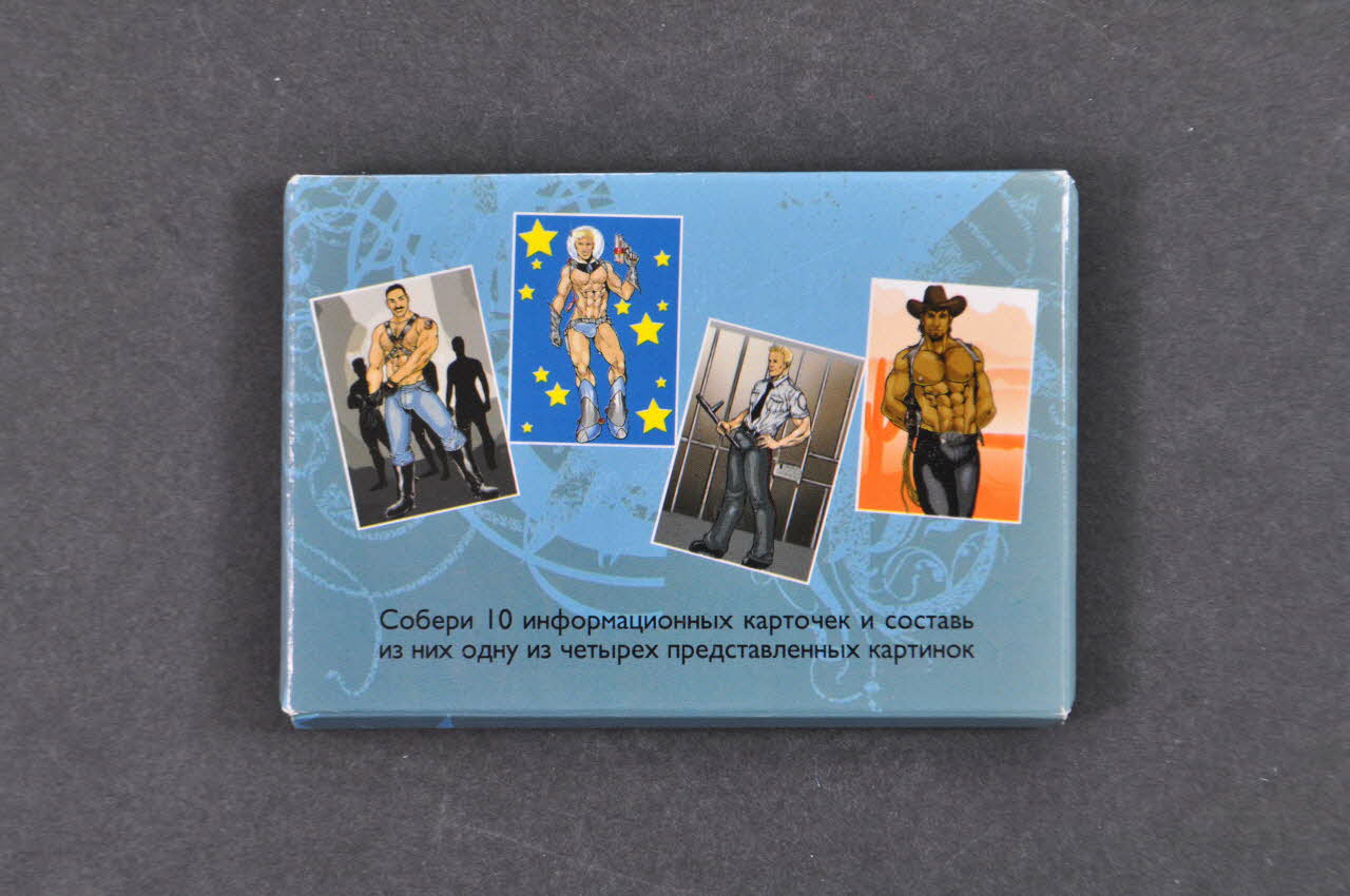 A l'intérieur de l'enveloppe est rangé le jeu, constitué de dix cartes. Le recto de celles-ci forme un puzzle représentant un homme, musclé, vêtu d'un uniforme de policier, tenant une matraque devant une cellule.