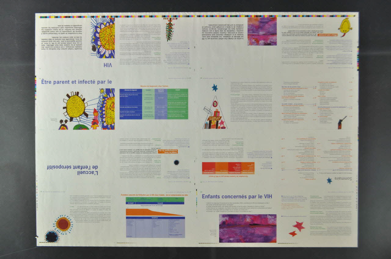 Maquette imprimée recto-verso en trois registres superposés allant de la page 1 à 32. Suite de la brochure de la page 33 à 44 en 2005.97.9.3.1-2. Echelle de couleurs pour impression sur les côtés de la maquette. Brochure avec texte polychrome, tableau et reproductions de dessins d'enfants. Sommaire pages 4 à 6.Matériaux et techniques
