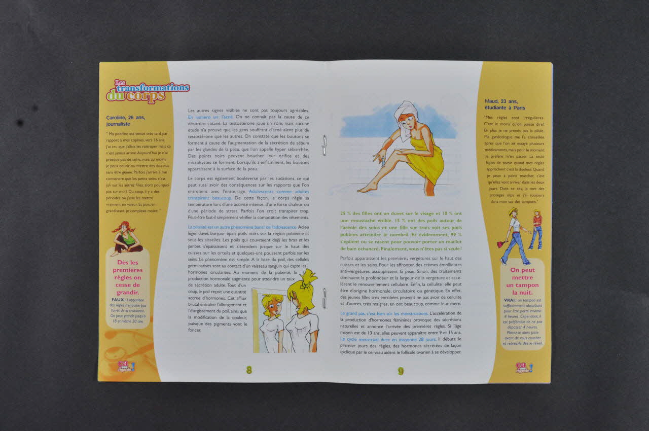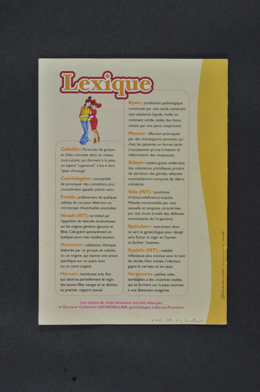 Résumé: p.3-6. "Le rôle du gynécologue" Sur les préservatifs, les MST (dans la première partie) "En même temps (que la pilule), le gynécologue conseille l'usage du préservatif masculin, facile à se procurer, sa mise en place est simple. Deux précautions valent mieux qu'une ! N'oubliez pas le préservatif féminin qui se place dans le vagin, à condition de bien connaître son anatomie. Il existe une taille unique et on se le procure sans ordonnance dans les pharmacies ou les centres du Planning familial. / Une mauvaise utilisation des préservatifs (déchirure, retrait trop tardif du partenaire occasionnant des fuites, oubli dans la précipitation) nuira à leur efficacité, mais ils restent la meilleure protection contre les IST." / "Autre rôle important du gynécologue, la prévention des IST, maladies contagieuses qui se contractent par les rapports sexuels. Vous savez... Le SIDA, l'hépatite B, l'herpès génital, les condylomes, les chlamydias, la syphilis. Le SIDA est la plus grave des IST car on ne le guérit pas actuellement. Toutefois dans les 48 heures après la prise de risque, un traitement d'urgence peut détruire le virus avant son développement pour diminuer la probabilité de la contamination. / La prévention de toutes les IST est possible grâce à l'utilisation de préservatifs masculins ou féminins et en évitant les pratiques sexuelles à risques. Et si vous avez un doute, cconsultez votre gynécologue ou adressez vous aux centres de dépistage anonyme et gratuit (CDAG), dispensaires antivénériens (DAV), centres de Planification familiale (CPF), Centres médico-sociaux. - p.7-10: "Les transformations du corps" - p.11-14: "L'hygiène"