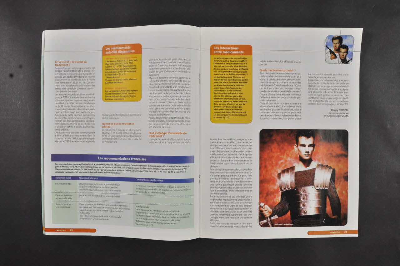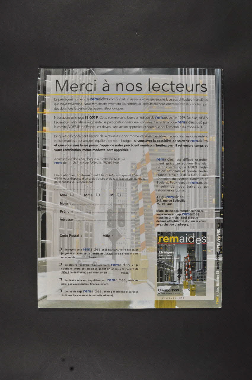 Résumé d'une partie de la revue: - p.3 Editorial sur 1 colonne. Titre en noir et bleu : "Des vitamines dans le stéthoscope.". A droite, colonne fond bleu, impression en blanc, vignette couleur : Chicago : "Vous êtes nombreux à nous l'écrire, de plus en plus souvent, l'espace d'écoute se réduit comme peau de chagrin. La prise en charge globale, médico-psycho-sociale tombe fréquemment aux oubliettes, au profit d'un regard triomphant sur nos examens biologiques enfin mieux maîtrisés" - p.4 col 1. Fond jaune, impression en bleu. En haut, en blanc sur bandeau bleu : "Actu". En dessous : "Les déplacements des masses grasses du corps (lipodystrophies) et les augmentations des graisses du sang préoccupent de nombreuses personnes séropositives. Les antiprotéases peuvent en être responsables, mais d'autres médicaments (notamment le Zérit ?) pourraient jouer un rôle. Et, surtout, l'infection à VIH perturbe le fonctionnement de l'organisme. On n'a, pour le moment, pas de véritable solution. Mais des conseils alimentaires peuvent améliorer la situation. " - p.4 col 2 3, p.5 col 1 Fond violet, impression en noir, sous titres en bleu : "Lipodystrophies (problèmes de graisse) : où en est-on ?" : "Les antiprotéases" / "Les autres médicaments" / "L'infection à VIH" / "Que faire ?" / Vitamines et autres". En bas, en blanc sur bandeau bleu : "Hausse des graisses du sang, lipodystrophies : les laboratoires pharmaceutiques n'ont entrepris aucune recherche digne de ce nom. De qui se moquent-ils ?". - p.5 col 2-3 Fond blanc, impression en noir, sous titres en blanc sur bandeau bleu : "Brèves" : "Des ordonnances plus claires" / "Norvir : en attendant les gélules" / "AIDES édite des documents d'information / Poésie" Illustration, en vignette noir et blanc : modèle agrandi de gélule vide. - p.6 col1 Fond jaune orangé, impression en brun. En haut, en blanc sur bandeau brun : "Témoigner". En dessous : "C'est dur d'avancer et de vouloir avancer encore avec 3 000 francs par mois. Malgré cela, je monte des projets grandioses" En dessous : tête masculine couleur sur format de carte à jouer. - p.6 col 2-3 Fond blanc, impression en noir, sous titres en brun : "Vivre dans la tourmente" / "Indépendant" / Tellement belle" / "Photo" - p.7 col1 Fond jaune , impression en bleu. En haut, en blanc sur bandeau bleu : "Actu". En dessous : "Le congrès américain annuel sur l'infection à VIH s'est déroulé à Chicago, du 31 janvier au 4 février. La plupart des médicaments présentés appartiennent aux mêmes familles que ceux dont on dispose aujourd'hui. Ils s'annoncent plus faciles à prendre et, pour certains, actifs sur les virus résistants aux traitements actuels. De plus, une piste nouvelle se dessine avec le T-20, qui bloque l'entrée du VIH dans la cellule." - p.7 col 2-3, p.8 et 9 Fond bleu, impression en noir, sous titres en bleu : "Congrès de Chicago : quoi de neuf ?" / "Trithérapies sans antiprotéase" / "Défense d'entrer !" (le T 20) / "ABT 378, une nouvelle antiprotéase" / "Traitements comportant deux antiprotéases" / "Médicaments actifs sur les virus résistants" / "Crixivan" / "Antiprotéases et non-nucléosides" / "Transmission de virus résistants" / "Kaposi" / "Prévention des infections opportunistes" / "Femmes séropositives enceintes". En vignette, photo de Chicago de la couverture. Photo couleur de l'affiche de la Conférence. Deux encadrés p.9 en noir sur fond jaune, titres en blanc sur bleu : "Doser les médicaments dans le sang" / "Les médicaments anti-VIH disponibles". - p.10 col 1 Fond orange , impression en brun. En haut, en blanc sur bandeau brun : "Témoigner". En dessous : "Les volontaires de AIDES sont présents dans de nombreux hôpitaux, au sein de permanences hospitalières, afin d'apporter écoute et soutien aux personnes séropositives. Mais, avec les progrès des traitements, certains services, certains médecins prétendent que AIDES n'a plus vraiment sa place à l'hôpital. Réponse d'un volontaire." - p.10 col 2-3, p.11 Fond blanc, impression en noir, sous titres en brun : "AIDES a-t-elle encore sa place à l'hôpital ?" / "Soutien, échange, amitié" / "Pouvoir se confier" / "Domaine réservé ?" Dessin humoristique en couleur légendé : "AIDES et ses volontaires gentiment poussés hors de l'hôpital...". P. 11 Encadré en noir sur fond jaune, titre en blanc sur fond brun : "Soif de vivre" / "Tout reconstruire" (témoignage). - p.12 col 1 Fond bleu , impression en vert. En haut, en blanc sur bandeau vert : "Regard". En dessous : " La perception et le vécu des traitements : tel est le thème de l'enquête menée par AIDES, à la fin de l'année 1998. Nous remercions les nombreux lecteurs de Remaides qui ont répondu au questionnaire. Les résultats détaillés de cette enquête seront publiés dans le livre Vivre avec le sida et communiqués lors d'un symposium organisé le 2 avril à Paris. Voici les premières impressions que nous avons ressenties à la lecture de vos réflexions." - p.12 col 2-3, p.13 Fond bleu, impression en noir, sous titres en bleu : "Les mille et une façons de prendre son traitement" / "Espoir et révolte" / "Désirs" / "Une arme" / "Réduire le fossé" / "Contre l'indifférence" / Photo légendée de la couverture du livre : "Vivre avec le sida. Témoignages"./ Encadrés en noir sur fond jaune, titres en blanc sur fond bleu : "Comment a été menée l'enquête" / Invitation" (au symposium) / "Enquête sur la douleur". - p.14 col 1 Fond vert , impression en orange. En haut, en blanc sur bandeau orange : "Se soigner". En dessous : "Sustiva, un nouveau médicament anti VIH, a suscité un grand intérêt en raison de son efficacité (qui, sur une durée d'un an, est comparable à celle des antiprotéases) et de sa simplicité de prise (une fois par jour). Cependant, il est important de connaître ses effets secondaires afin de parvenir à les gérer." - p.14 col 2-3, p.15 col 1 Fond vert clair, impression en noir, so
